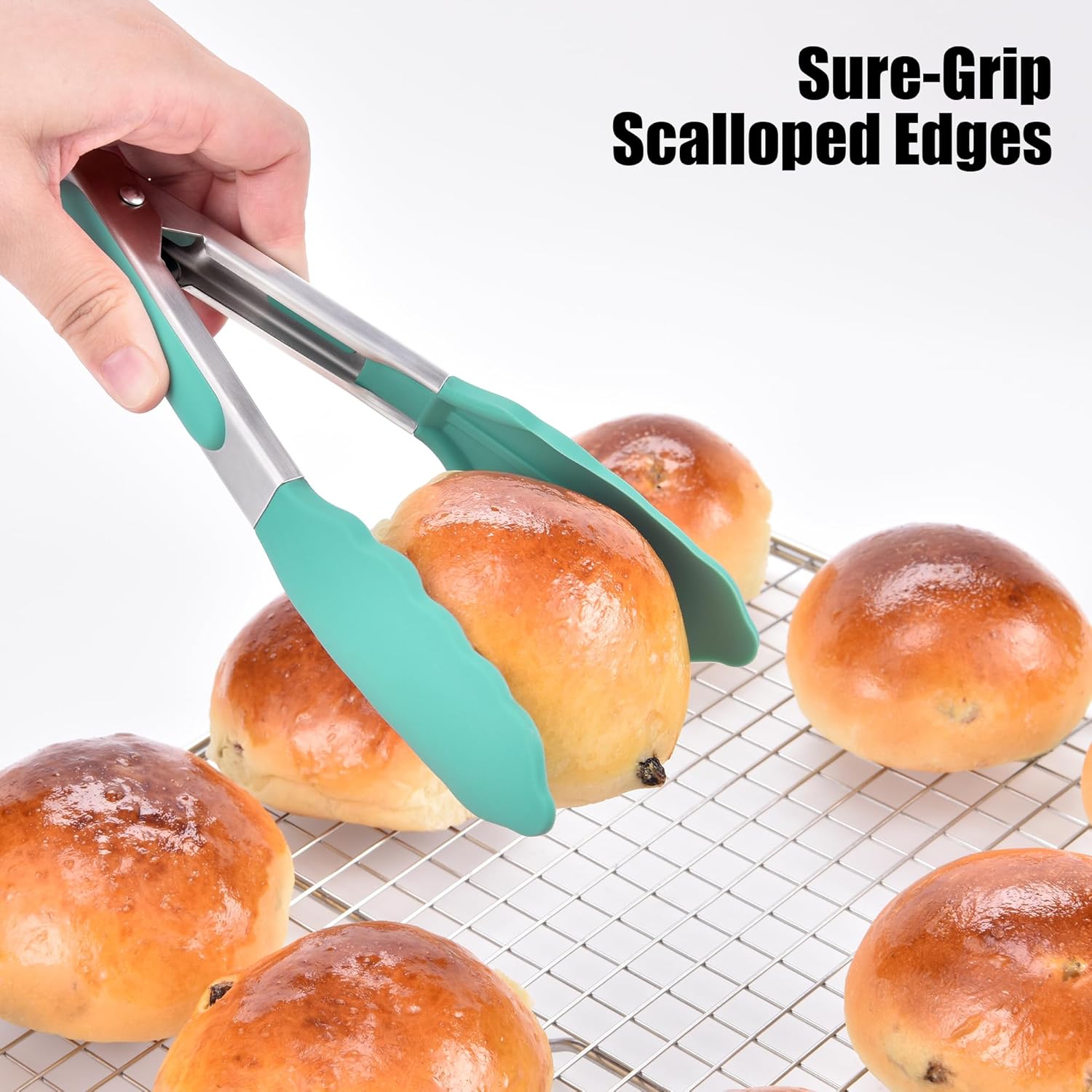 Doosu Kitchen Tongs for Cooking - 600°F Heat Resistant Food Tong with Non-Scratch Silicone Tips, Heavy Duty Stainless Steel Locking Tong for BBQ, Grilling Steak, Serving Salad, Pasta (7in, Aqua Sky)
