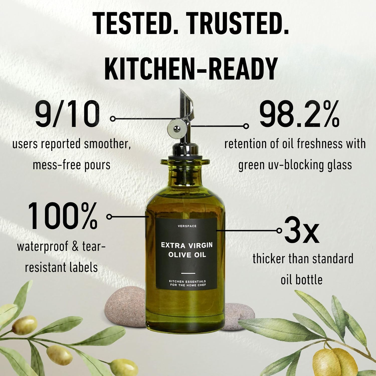 - PROTECT YOUR OIL IN STYLE: This elegant green olive oil bottle set is crafted from UV-blocking glass to preserve flavor, nutrients, and freshness. Whether you're storing extra virgin olive oil or avocado oil, your oils stay safe from sunlight and oxidation.