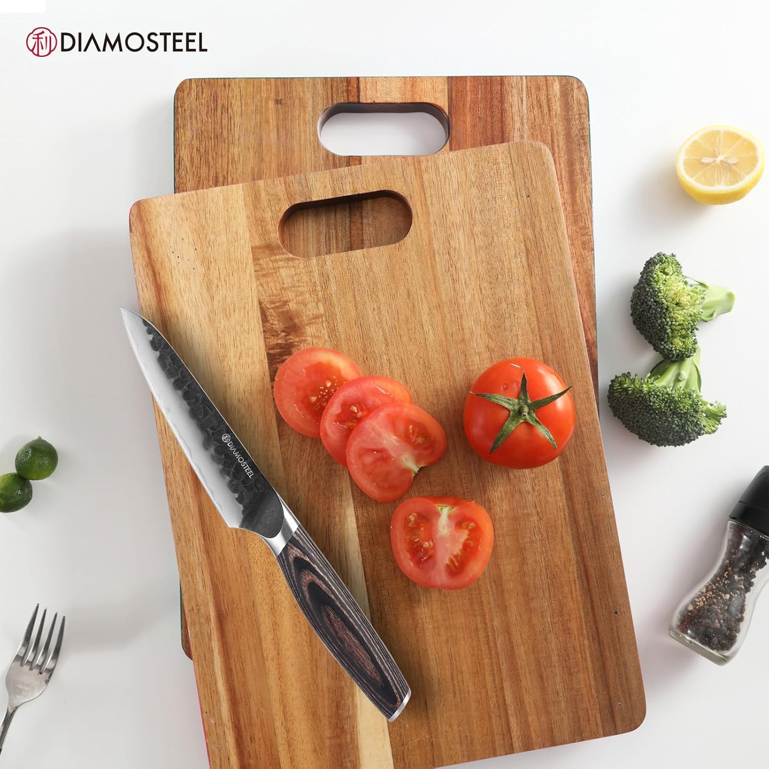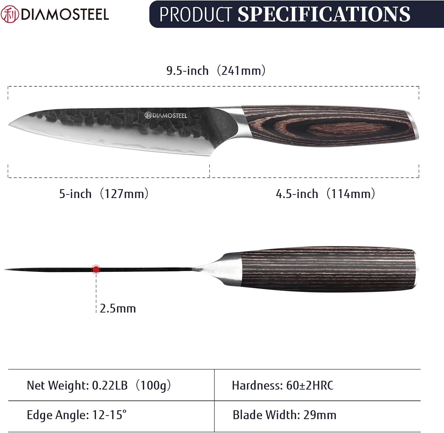 - Premium Triple-Layer Steel Blade - Say goodbye to dull kitchen knives. Our Diamosteel kitchen utility knife is crafted from high-quality 9CR18MOV three-layer composite steel, boasting a sharp edge honed to 12-15° and a hardness rating of HRC58-62. This ensures superior edge retention and rust resistance, making it your dependable cooking knife for years of precise slicing and dicing.