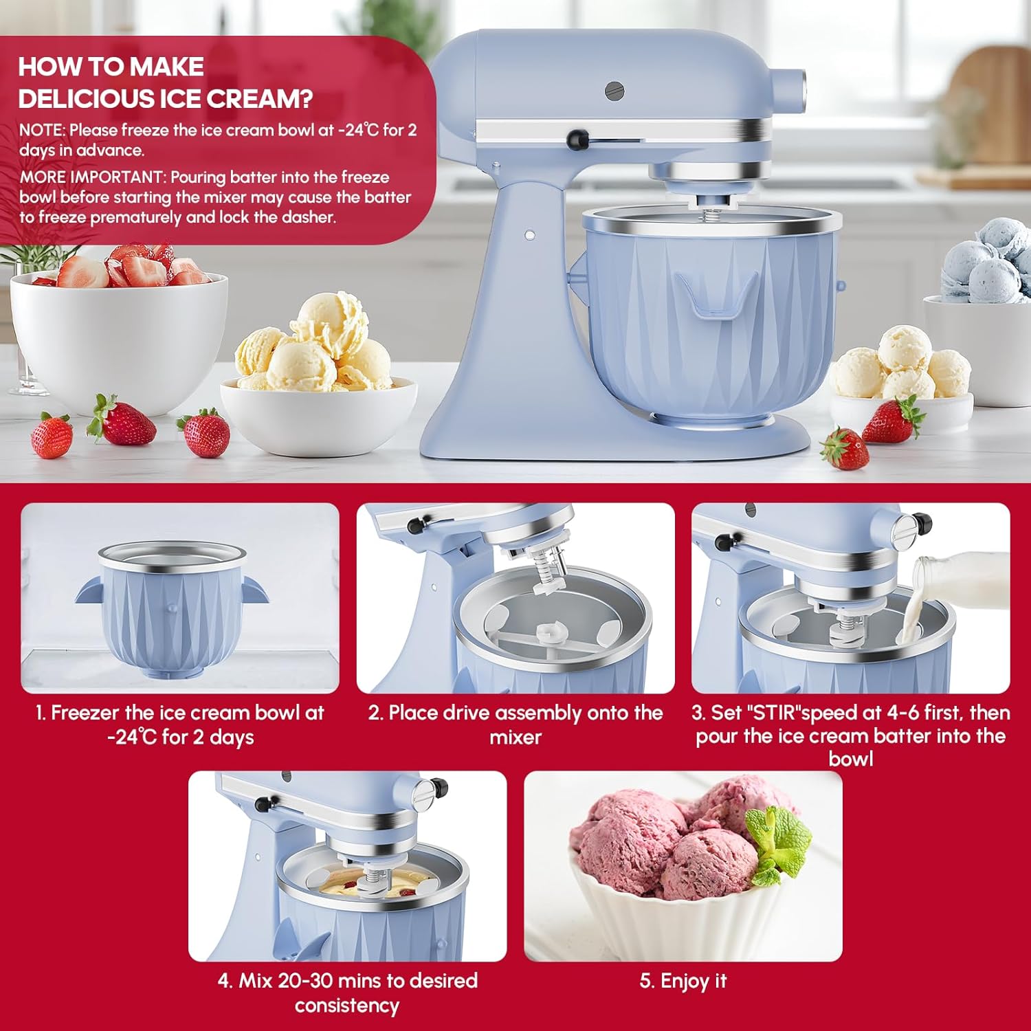 - HOW TO MAKING ICE CREAM: Place the kitchen aid ice cream maker in the freezer at -24° for 2 days in advance , attach the drive assembly to the mixer, turn on the power and set it to 4-6 speeds, start the stand mixer, then pour the ice cream mixture into the freezer bowl. After 30 minutes, you will have thick and creamy homemade ice cream. NOTE: Be sure to start the mixer before pouring the ice cream, otherwise the drive assembly will freeze and break. Do not stop mixing until the ice cream is formed.
