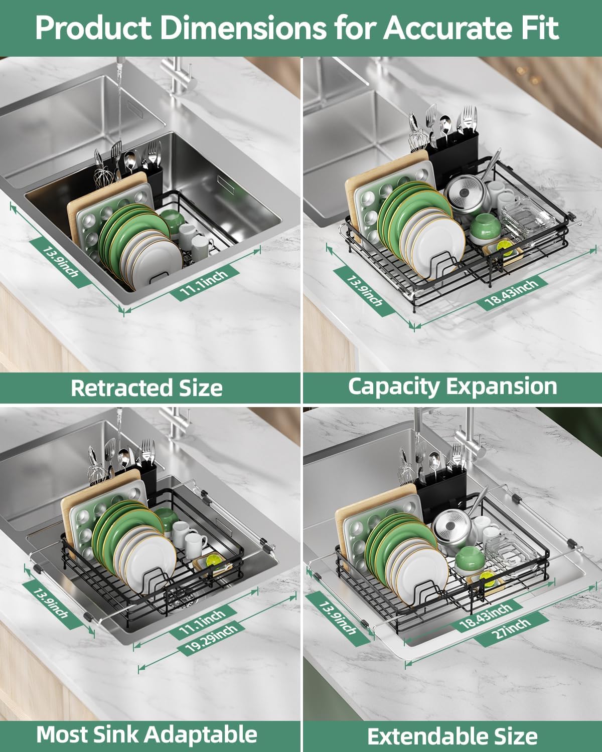 - 【Truly Expandable, Real Capacity Boost】The sink dish drainer not only extends its handles but also expands its full body, significantly increasing your drying space by 35%. This allows you to comfortably hold 8 plates, 4 bowls, 4 cups, plus all of your family's utensils. It can even serve as a fresh fruit and veggie draining basket