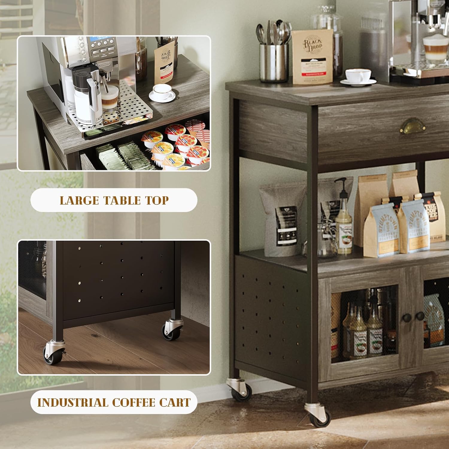 Catrimown Coffee Cart Station, Coffee Stand Station, Small Microwave Stand with Drawer, Movable Farmhouse Coffee Station Table on Wheels for Living Room, Entryway, Dining Room, Kitchen, Wash Grey