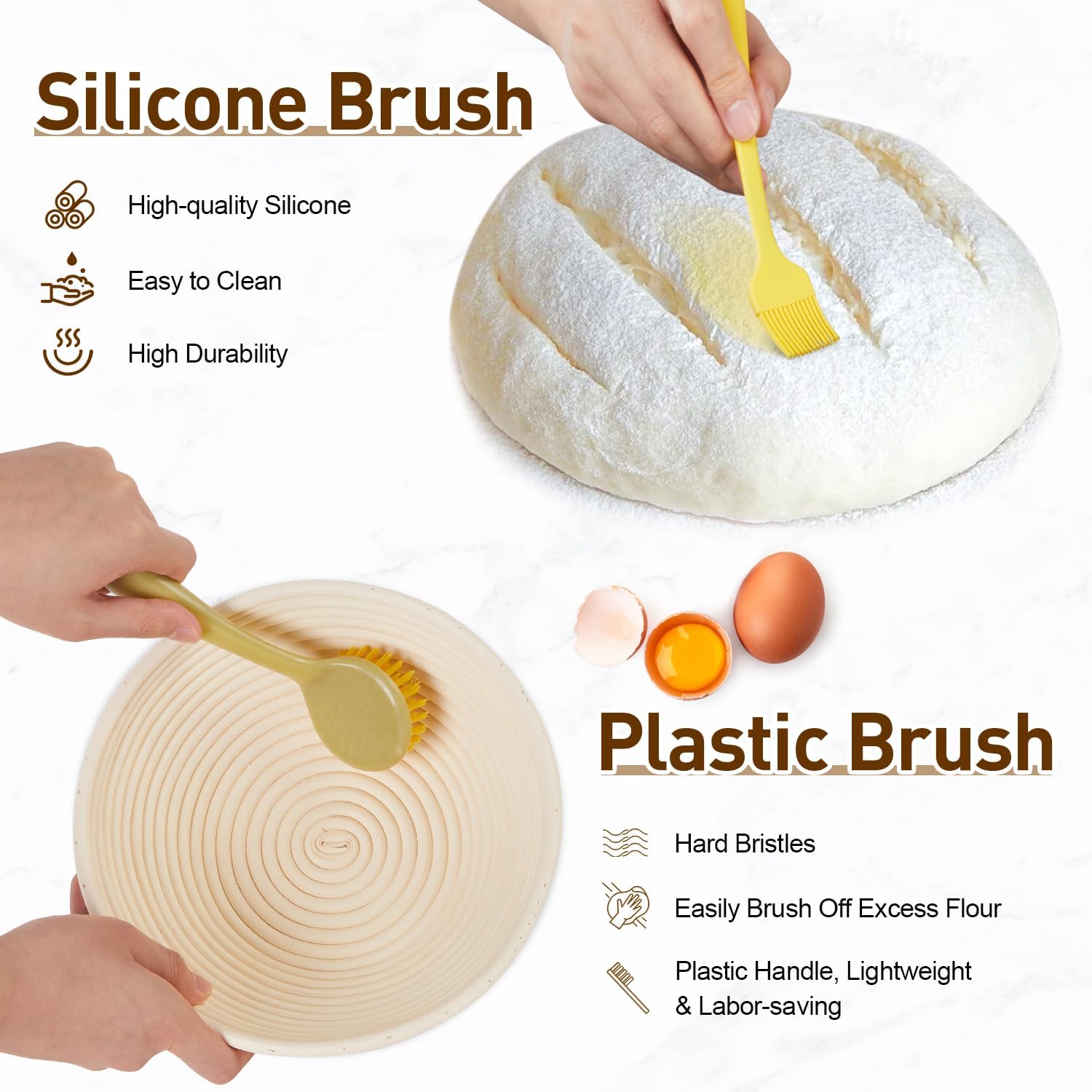 - [What Will You Get] The Sourdough Starter Kit Includes: 1x 9 Inch Round Banneton Basket, 1x 10 Inch Oval Proofing Basket, 2x Linen Liners, 1 × Dough Whisk, 1 × Bread Lame with 5 Blades, 1 × Dough Scraper, 1 × Bowl Scraper, 1 × Silicone Brush, 1 × Cleaning Brush, 1 × Flour Duster, 16 × Baking Stencils, 1 × User Manual. These sourdough bread baking supplies are designed for both beginners and professionals—everything you need to create delicious artisan loaves with ease.