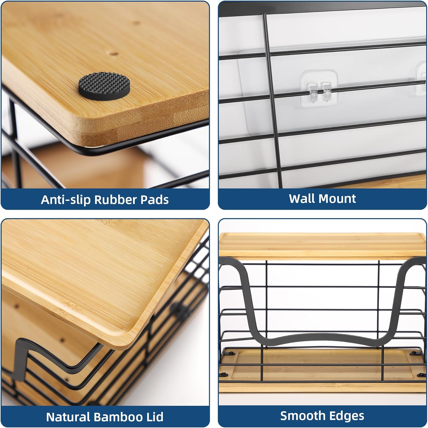 - Space-Saving Stackable Design. The bamboo tops feature a recessed groove, allowing safe stacking for vertical space optimization. Whether placed on the countertop or mounted under the sink, these holders are compact yet highly functional.