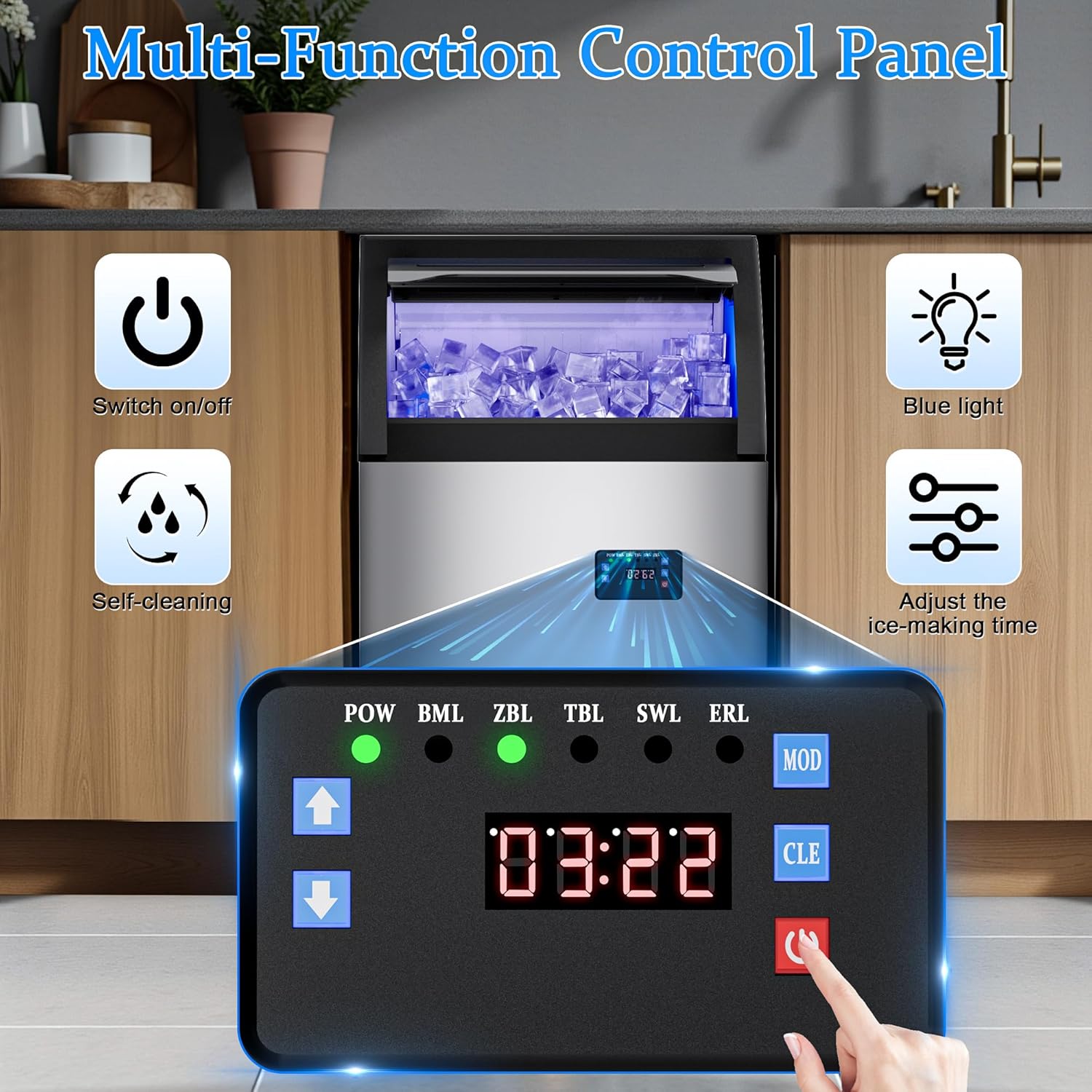 - Smart Control Panel: Our under counter ice maker are equipped with LED digital displays and mechanical buttons for operation, allowing you to adjust ice thickness, self-clean, and activate built-in blue lighting and fault alarms (indicator lights), enabling precise control over the ice-making process.The matching water filter ensures clean and hygienic ice production, providing you with fresh, healthy, and crystal-clear ice cubes at all times.