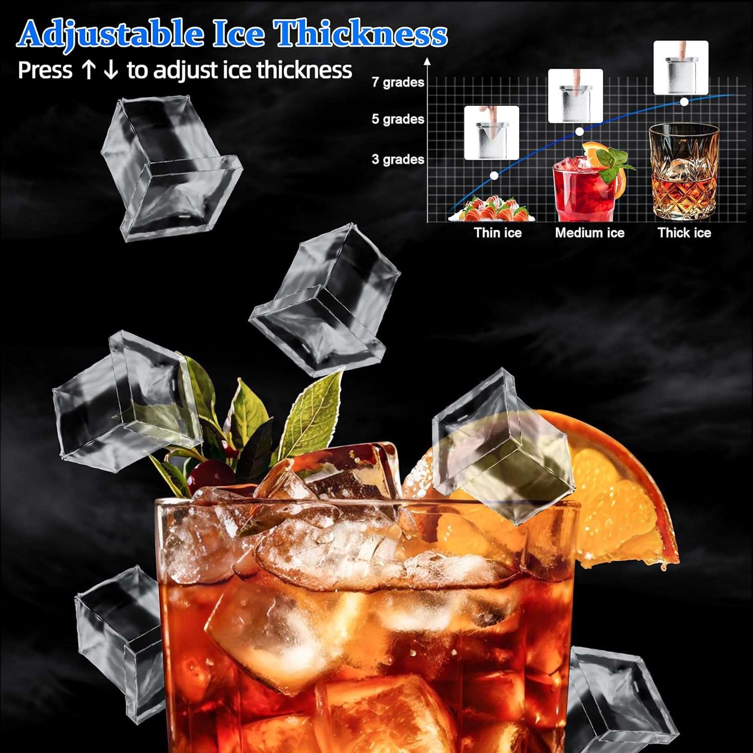 - Upgraded Ice Maker: Our commercial ice maker uses new spray drench Ice Maker technology to produce harder, clearer ice cubes that melt more slowly. The thickness of the ice cubes can also be adjusted to suit different beverages, such as drinks, coffee, cocktails, etc. It is ideal for use in homes, bars, cafes, restaurants, hotels, and any other setting where ice cubes are required.