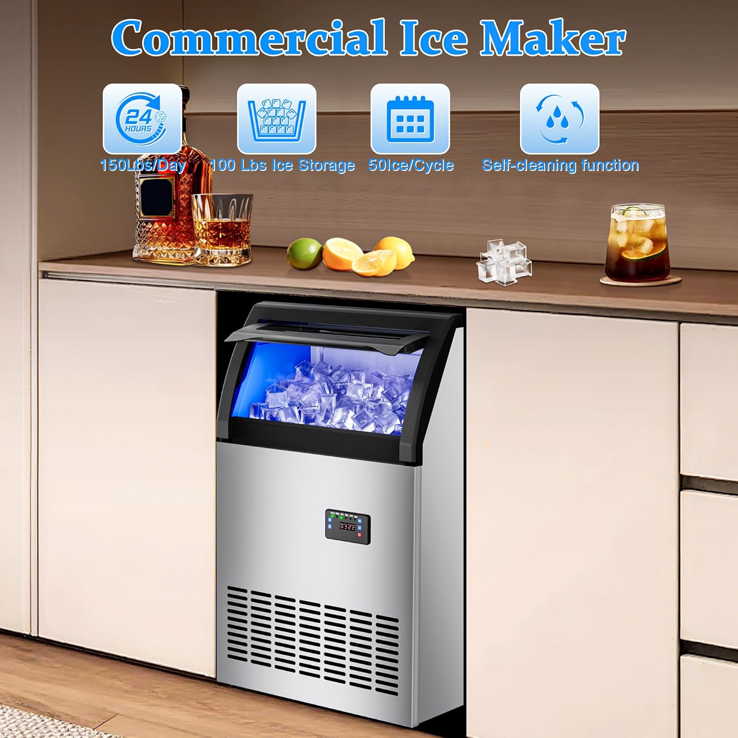 - Efficient Ice Making and Ice Storage: Our spray drench ice maker an produce up to 150 lbs of ice per day, built-in storage box holds 100lbs of ice, commercial ice machines can produce 50 cubes/cycle in 12-16 mins ,can meet your daily ice needs, making it ideal for high-traffic venues, It can keep supplying ice steadily even during peak hours.