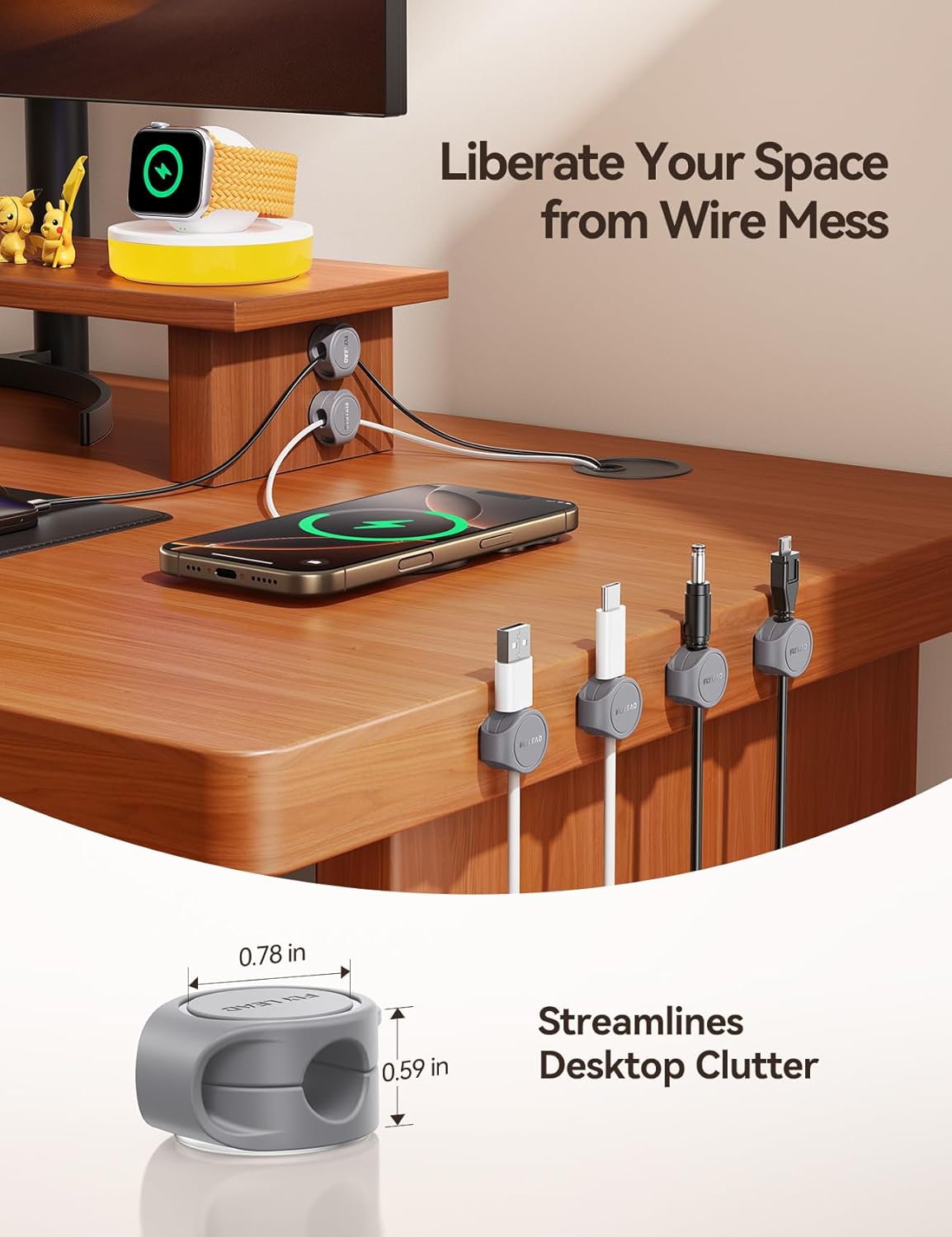 - Special Designed Silicone Magnetic Cable Clips: One-piece silicone molding design FLYLEAD cord organizer with better moldability, the soft silicone material makes this cable organizer more malleable and skin-friendly. After over 10,000 times of tensile tests, the flexible upper and lower joints never broke. With the strongest N55 magnets, covers can be tightly adherent to each other, soft silicone-made FLYLEAD cord holder could embrace cables, which won't squeeze or damage the cables