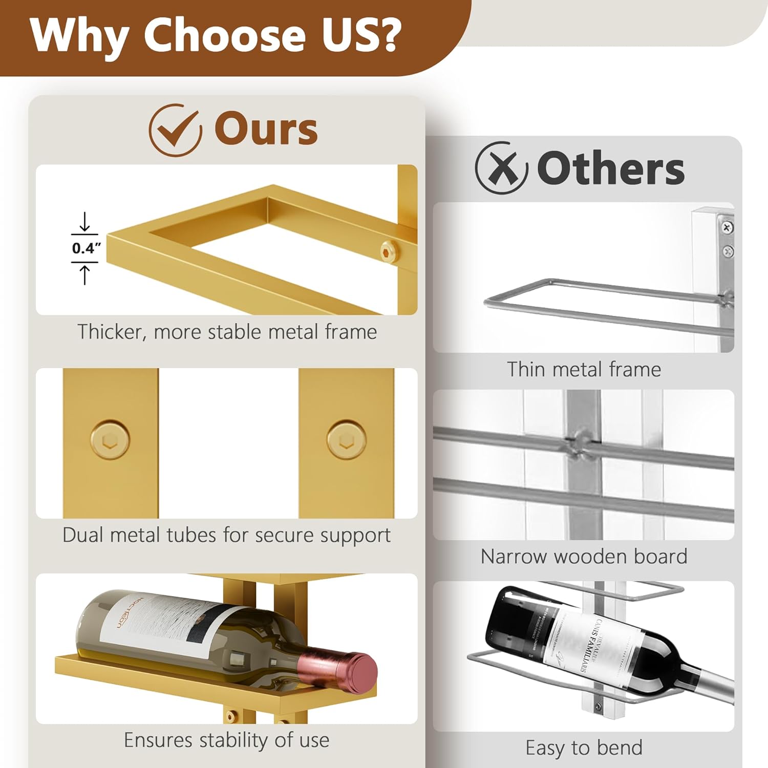 - 【Sturdy Structure】 With metal and high-strength welding technology, and using multiple screws to fix it to the wall, which makes this wall-mounted wine rack is not easy to bend, enough to firmly fix the wine bottles and can be used for a long time.