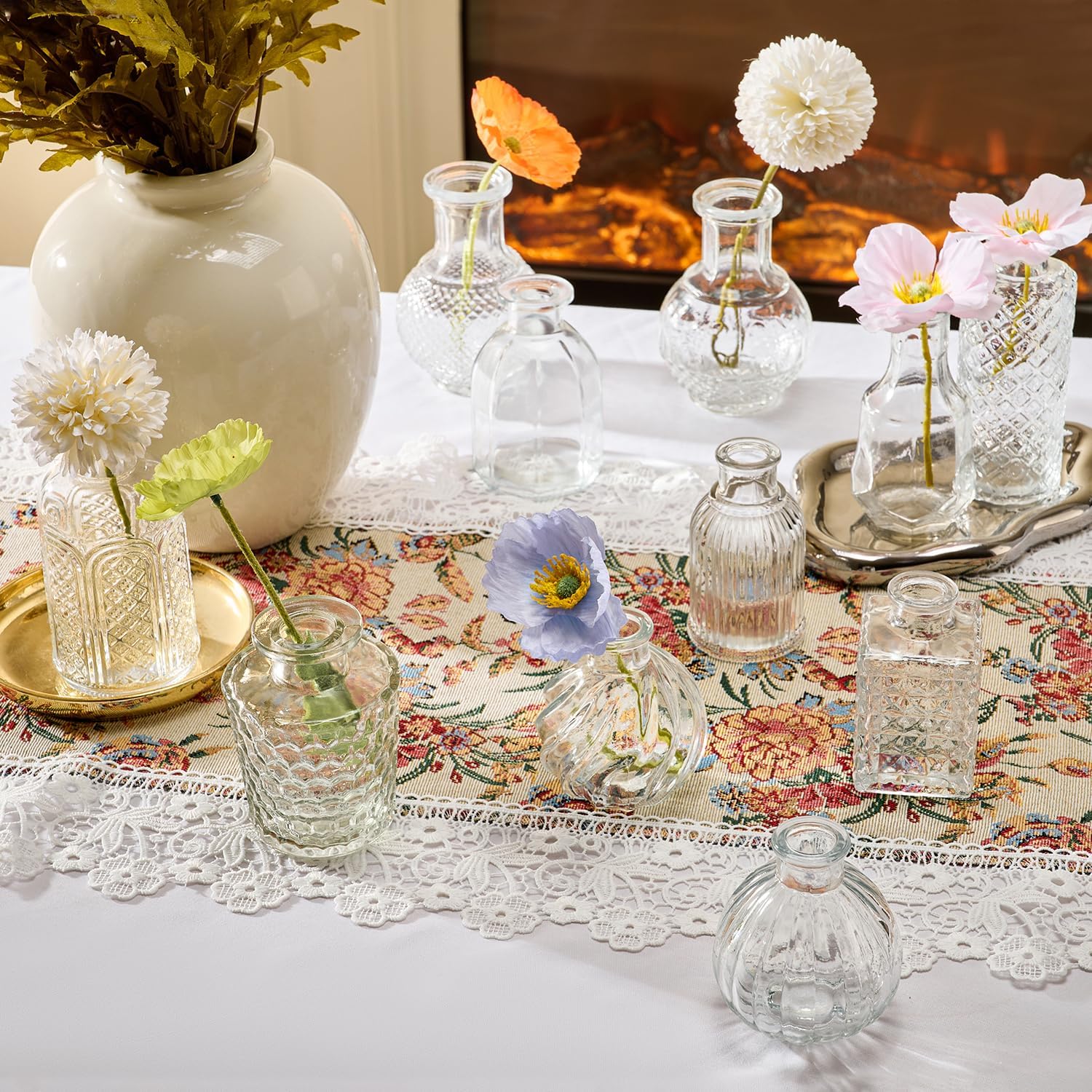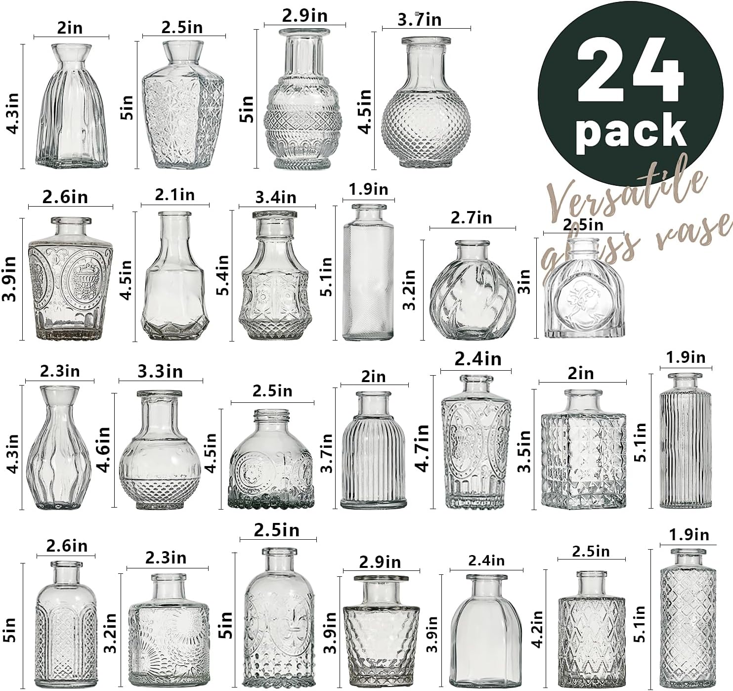 - Versatile Flower Bud Vase Set: This set comprises 24 diverse transparent glass flower bud vases, each adorned with etched designs to further elevate their charm. It is perfectly suited for any home décor. Whether placed as a centerpiece on dining tables, window sills, or wedding banquet tables, these small vintage crystal vases will lend an air of elegance to the setting.