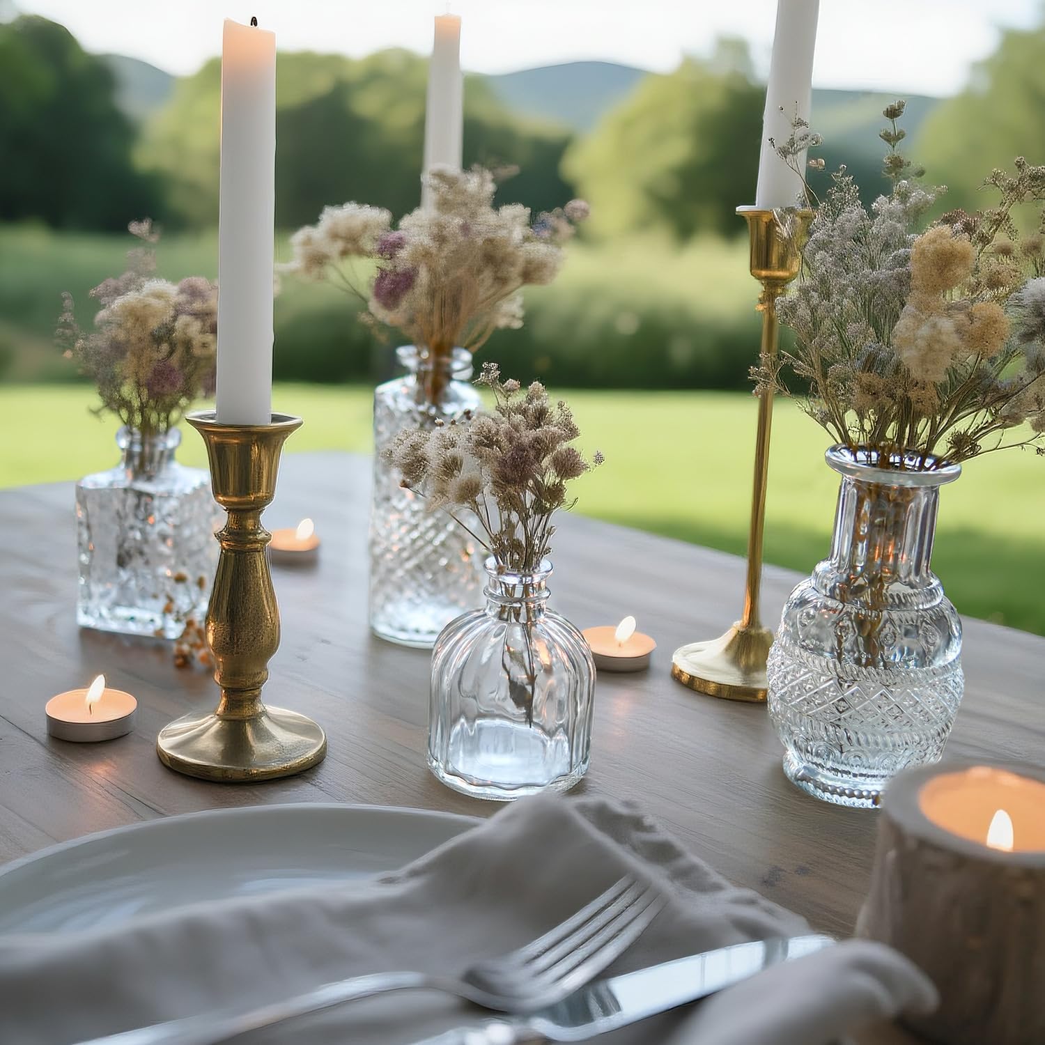 - Versatile Flower Bud Vase Set: This set comprises 16 diverse transparent glass flower bud vases, each adorned with etched designs to further elevate their charm. It is perfectly suited for any home décor. Whether placed as a centerpiece on dining tables, window sills, or wedding banquet tables, these small vintage crystal vases will lend an air of elegance to the setting.