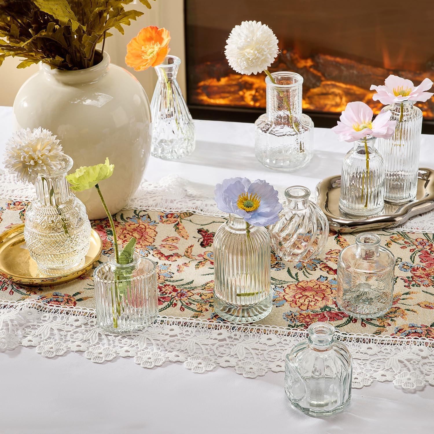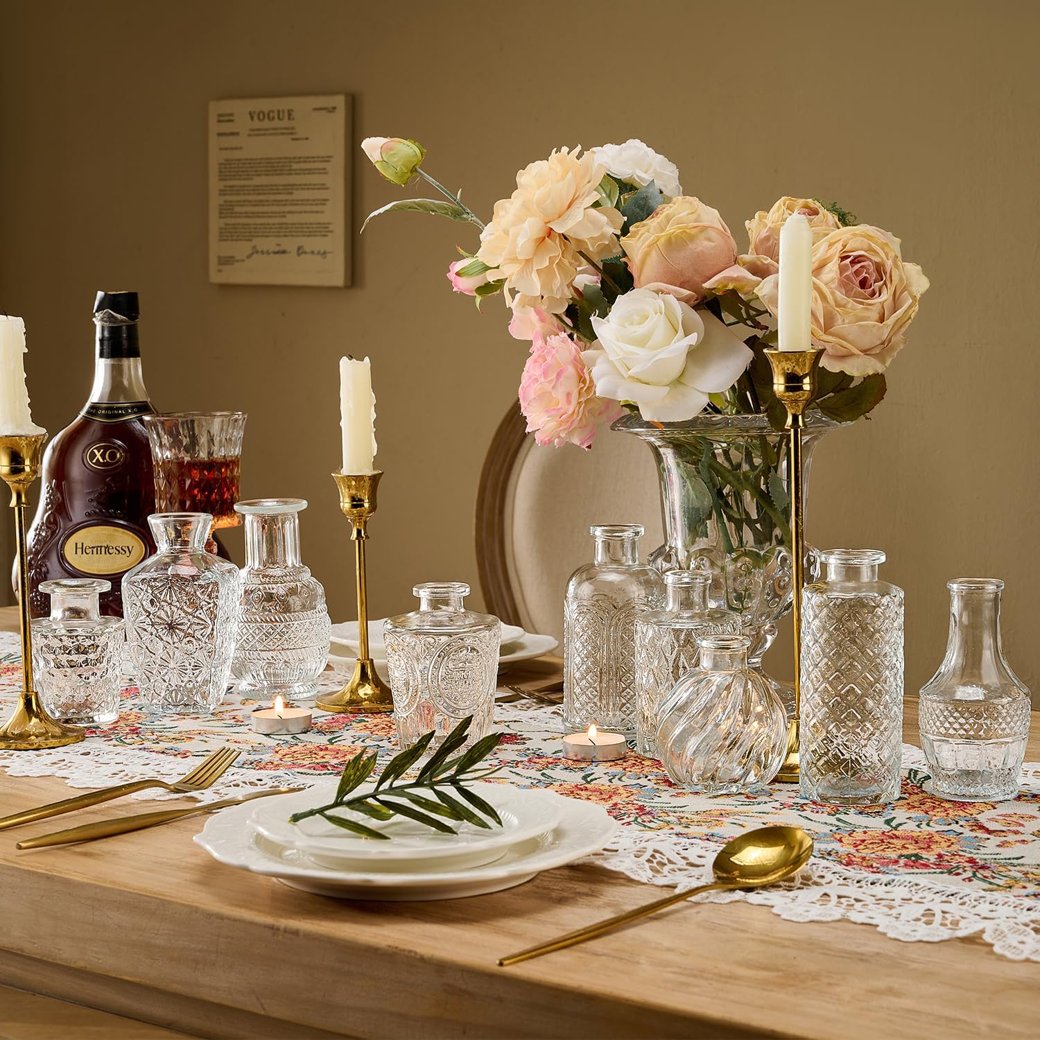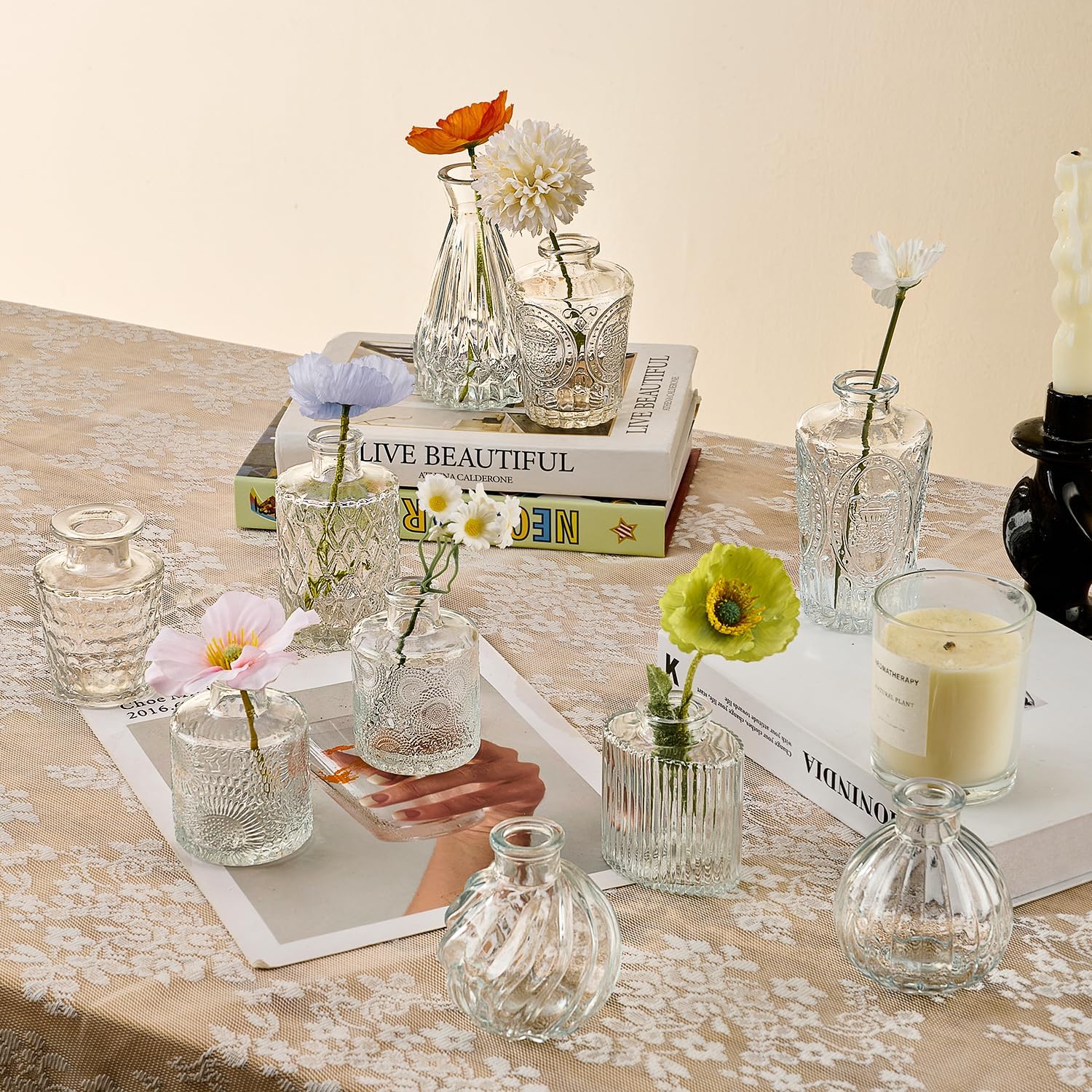 - Versatile Flower Bud Vase Set: This set comprises 33 diverse transparent glass flower bud vases, each adorned with etched designs to further elevate their charm. It is perfectly suited for any home décor. Whether placed as a centerpiece on dining tables, window sills, or wedding banquet tables, these small vintage crystal vases will lend an air of elegance to the setting.