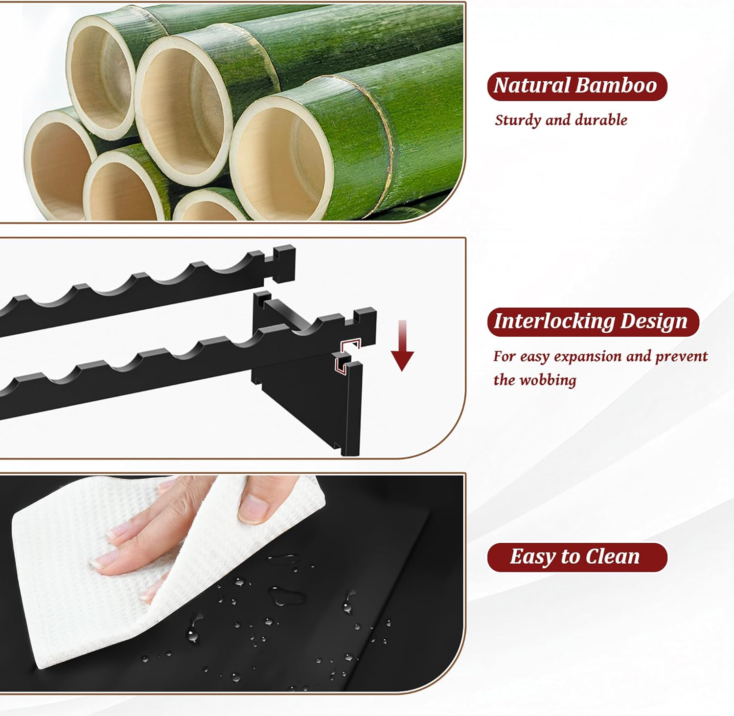 - 8 Tier Stackable Design: Features a layered structure w/ stackable design. Each piece of the bamboo wood has notches & slots which are deep so they can fit together well, makes the wine display shelf more sturdy & wobble-free on the wood floor or the carpet