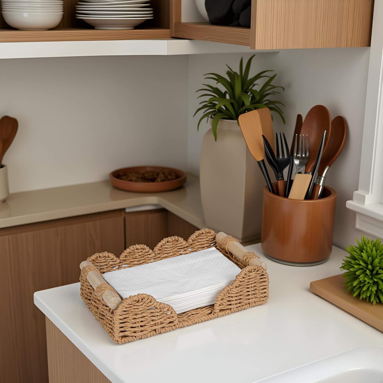 - Handwoven with Premium Paper Rope - Each napkin holder is hand-woven from paper rope and wrapped wooden handles. It is chemical-free. Biodegradable and eco-friendly material, durable. Natural texture add a warmth to kitchen home decor.