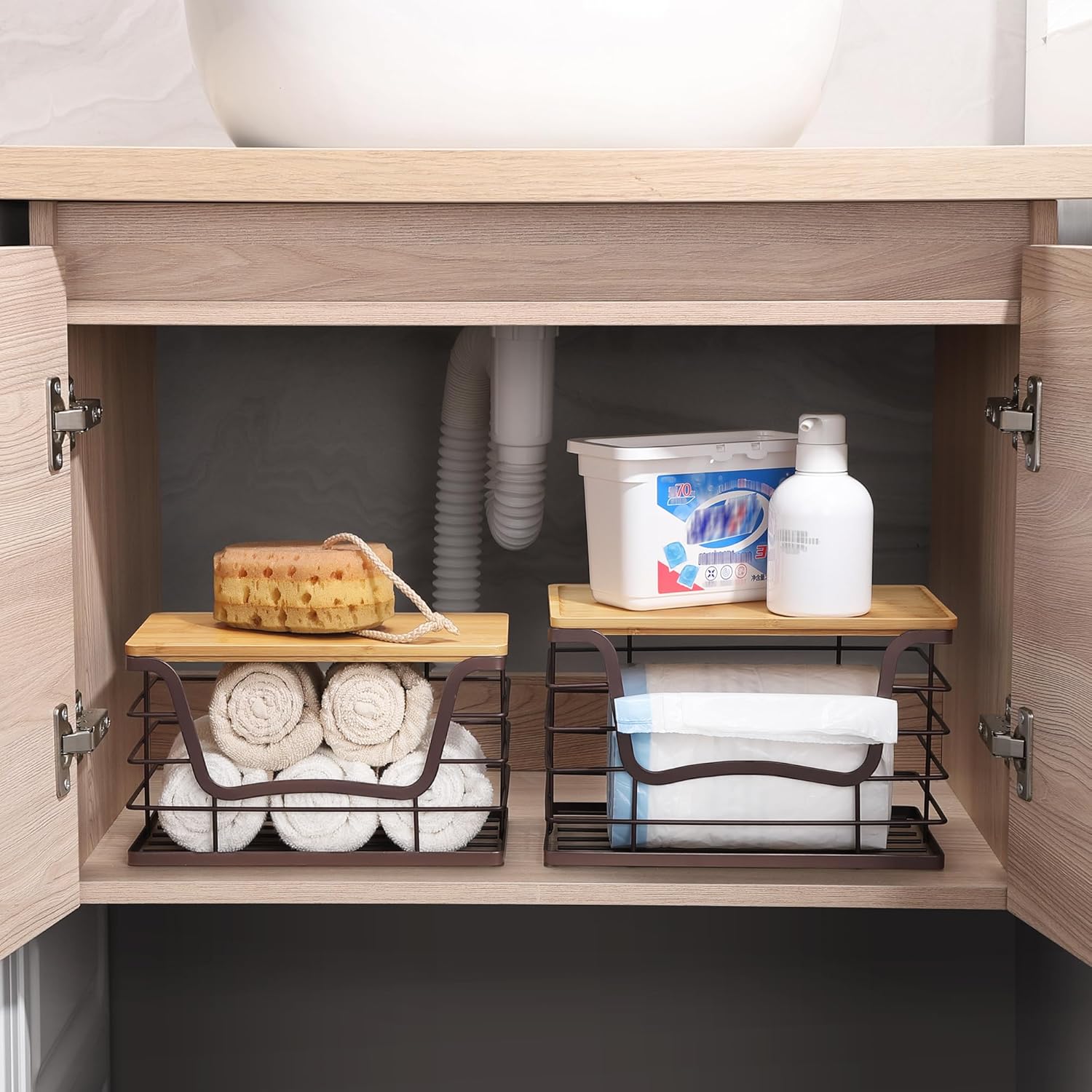 - Easy to Use & Extra Storage. Both dispensers feature wide openings for quick and easy trash bag access. The removable bamboo lids double as shelves for extra storage, allowing you to clearly see and easily reach the items inside—no assembly required, making organization effortless.