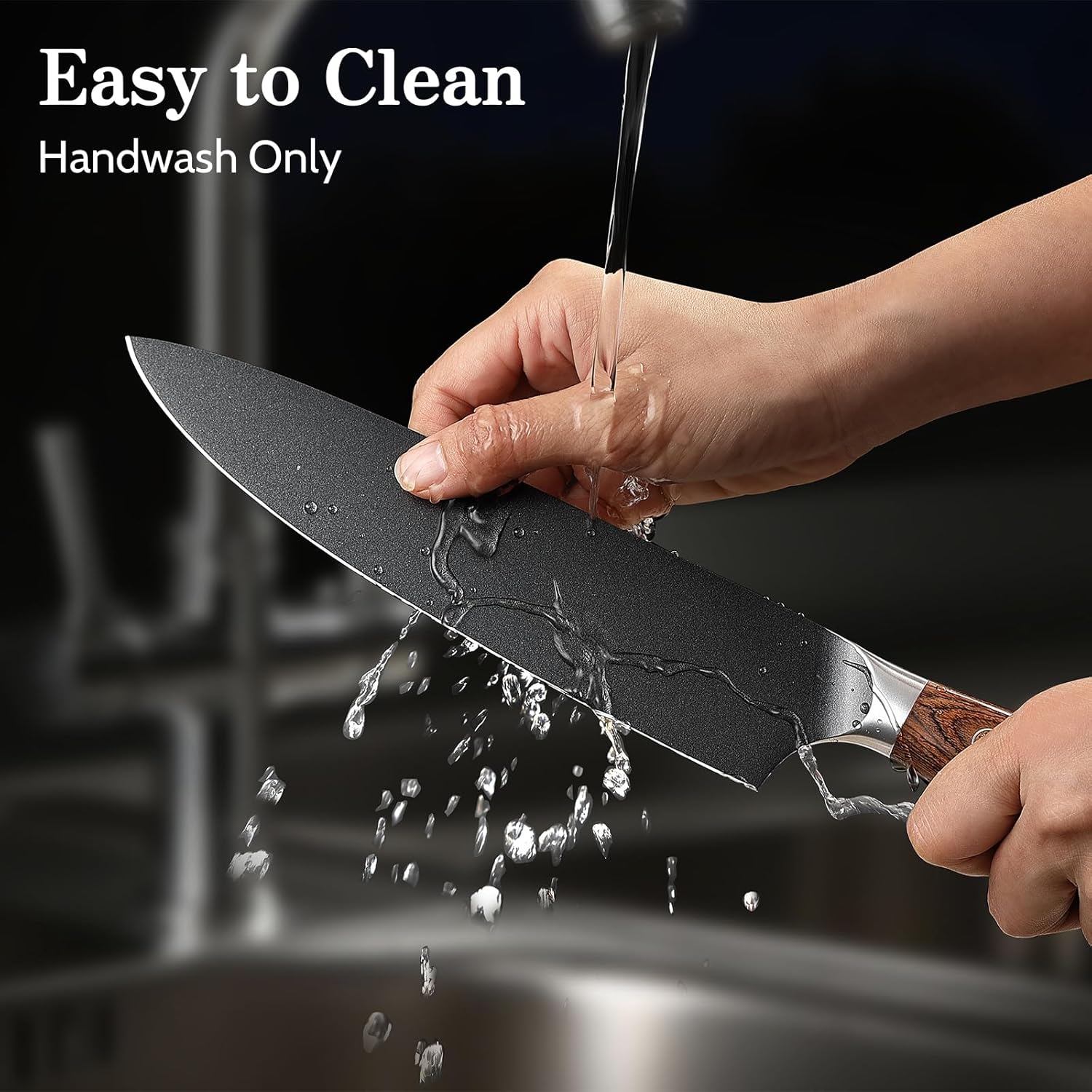 - 【Well-Balanced Kitchen Knife Set】The blades and handles of this set are perfectly balanced, allowing you to easily tackle everyday kitchen tasks like chopping, slicing, and dicing. The ergonomic wooden handle provides superior comfort, helping to minimize fatigue, numbness, or pain during use.