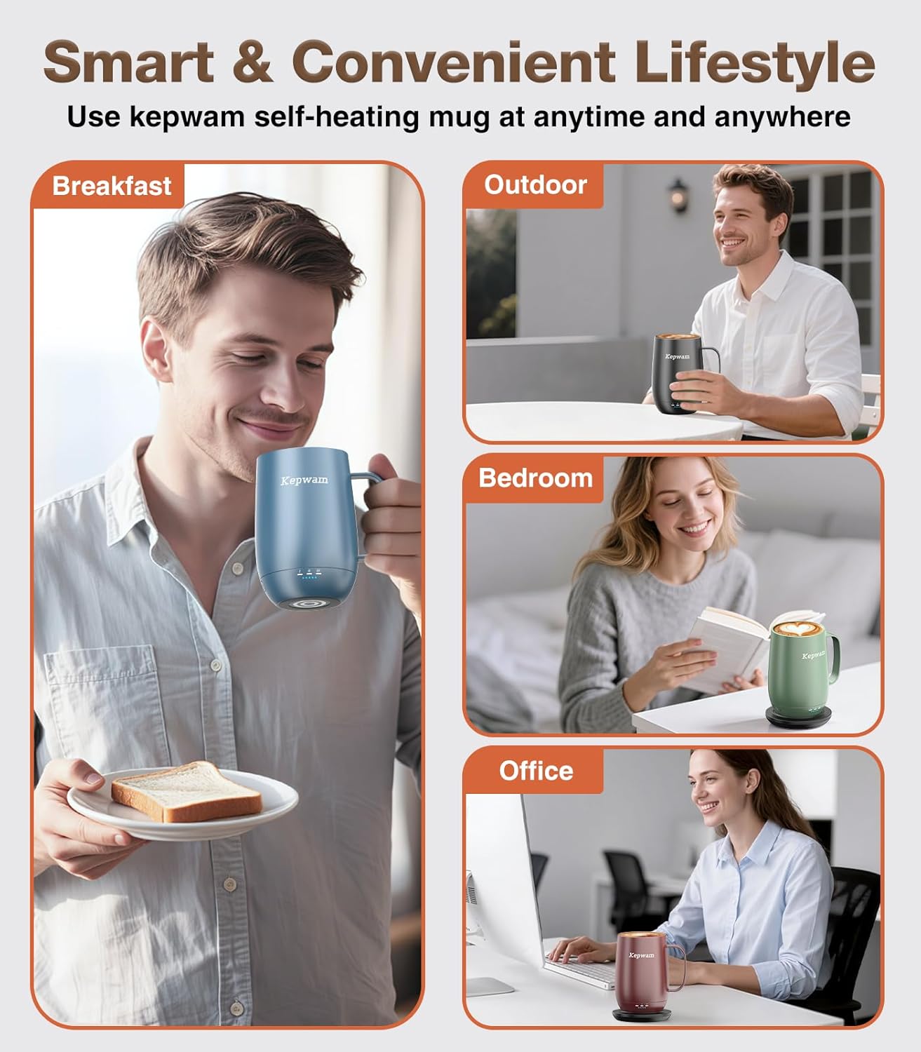 - One-Touch Control, No App Needed – Choose from 3 temps (113°F, 131°F, 149°F) with clear LED indicators. The Kepwam will keep your hot coffee, tea or preferred beverage at the perfect temperature wherever you are.