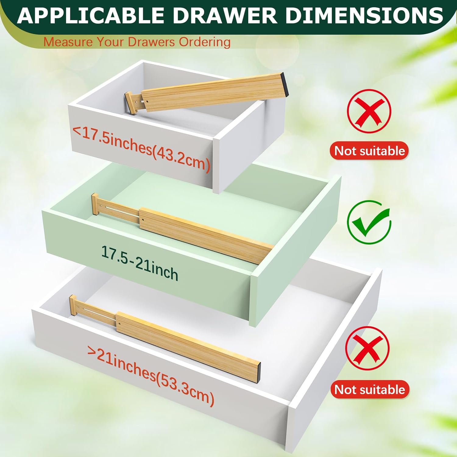 - 【Measure Drawer Size】Please measure your drawer before purchasing! This set of bamboo drawer dividers is designed for drawers with an internal height of less than 2.36 inches and a length of 17.5 to 21 inches. If your drawer's internal height is less than 2.36 inches and its length is either less than 17.5 inches or exceeds 21 inches, it will not work
