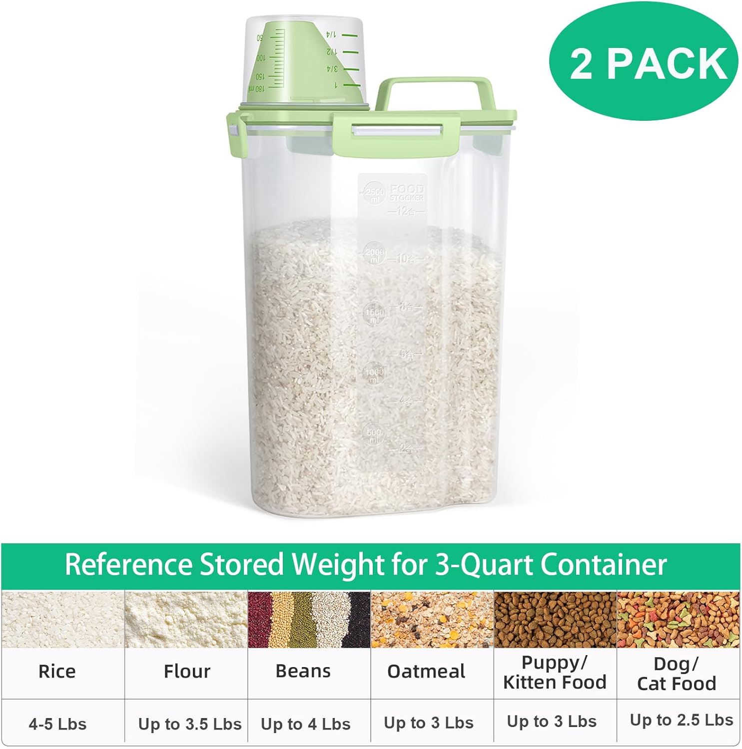 TBMax Rice Container Cereal Storage Container 2 Pack 5 Lbs, Plastic Kitchen Pantry Food Storage Container with Cup, Small Pet Dog Cat Food Dispenser -Green