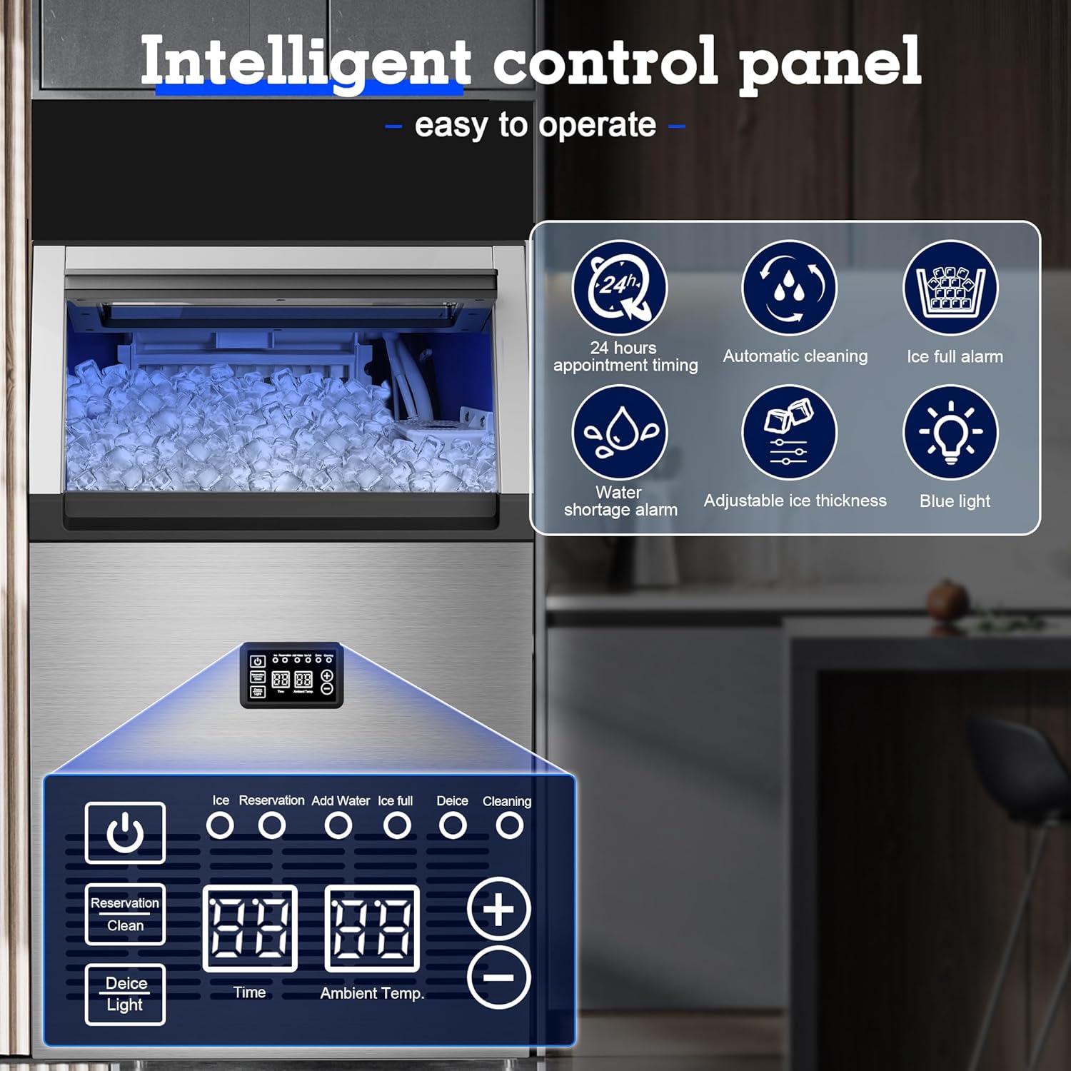 - Upgraded Powerful Compressor: This commercial ice maker is equipped with a powerful compressor with fast, efficient and stable performance, and it doesn't make too much noise. 20% faster ice production, larger ice production capacity, this commercial ice maker is perfect for weekend parties, homes, restaurants, bars and offices.