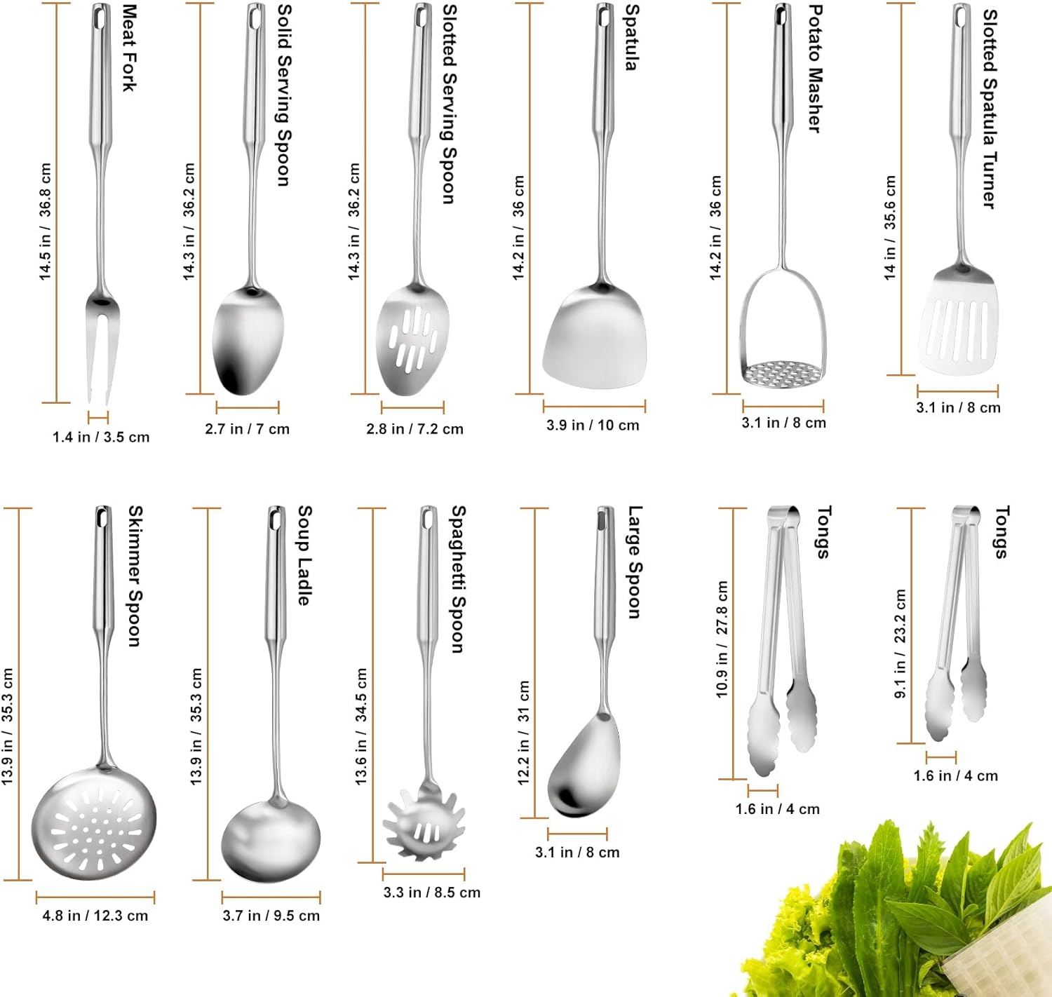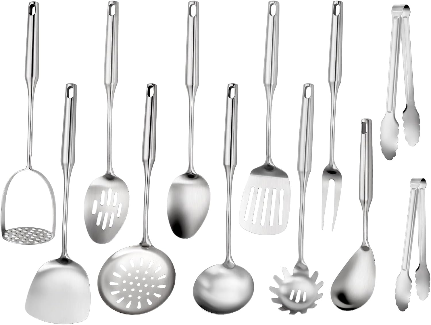- COMPLETE 12-PIECE SET: This 304 stainless steel kitchen utensils set has everything you need! It includes 1 potato masher, 2 tongs, 1 meat fork, 1 solid serving spoon, 1 slotted serving spoon, 1 spatula, 1 skimmer spoon, 1 slotted spatula turner, 1 soup ladle, 1 spaghetti spoon, 1 large spoon. Whether you're cooking a quick weeknight meal or hosting a big dinner party, this 12-piece metal utensils set has the right tool for every task