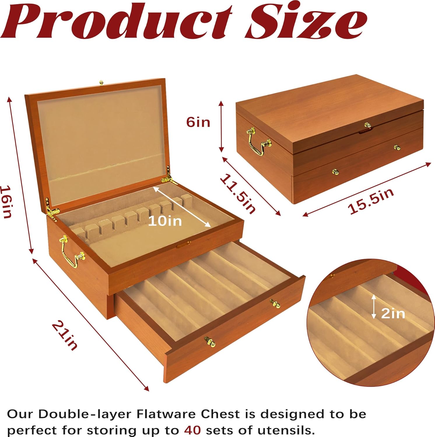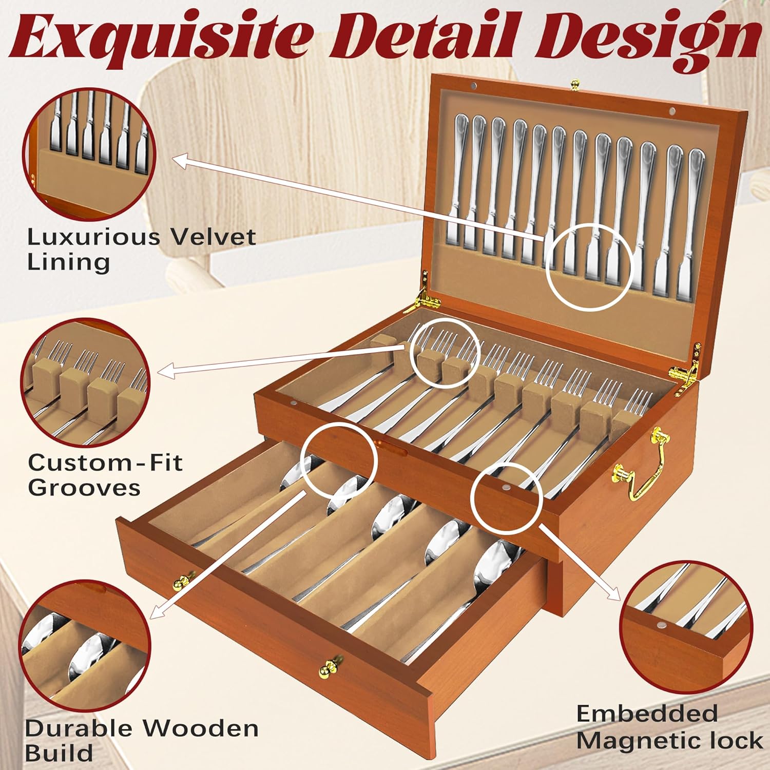 - 【Luxurious Velvet Lining】The interior is lined with luxurious red velvet, providing a soft and protective cushion for your silverware. This premium lining not only prevents scratches and tarnish but also adds a sophisticated touch, making the box a standout piece in your home