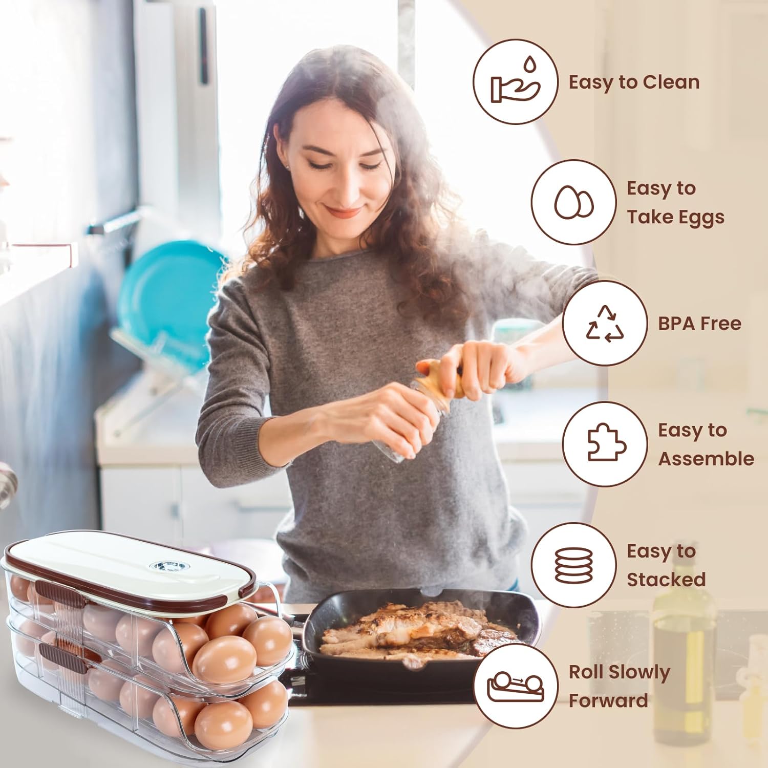 Egg Holder for Fridge, Automatic Rolling Egg Organizer for Refrigerator, Clear Plastic Egg Container & Tray, Stackable Dispenser and Storage Bin For Organizers and Storage -2 Layer
