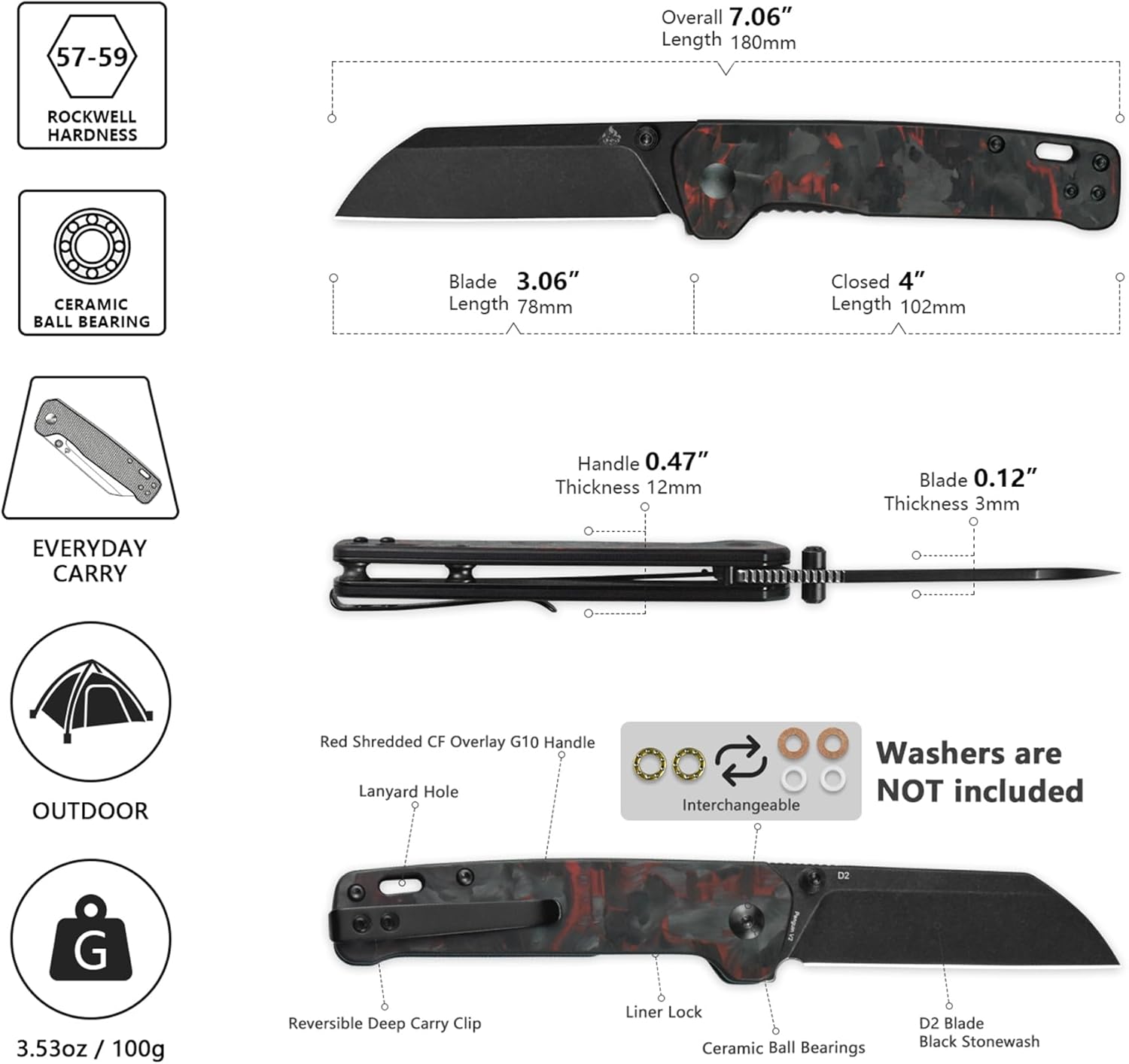 - Color : Black Stonewash Blade, Red Shredded CF Overlay G10 Handle