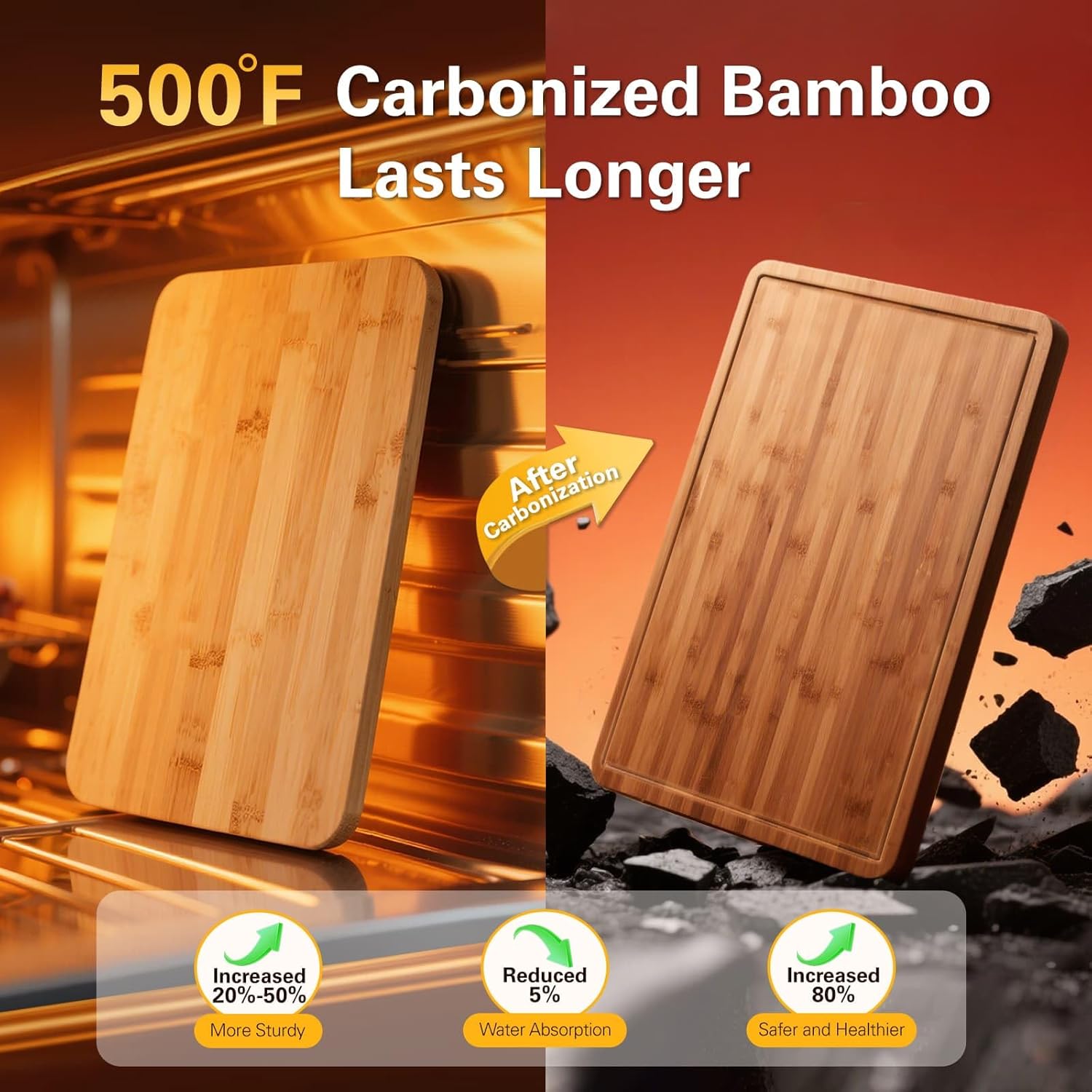 - Heat-Treated for Durability: Carbonized at 500°F, our bamboo cutting boards offer up to 50% more durability and 5% less moisture absorption. The enhanced toughness and smooth finish not only prevent warping but adds a warm, natural look that elevates any kitchen.