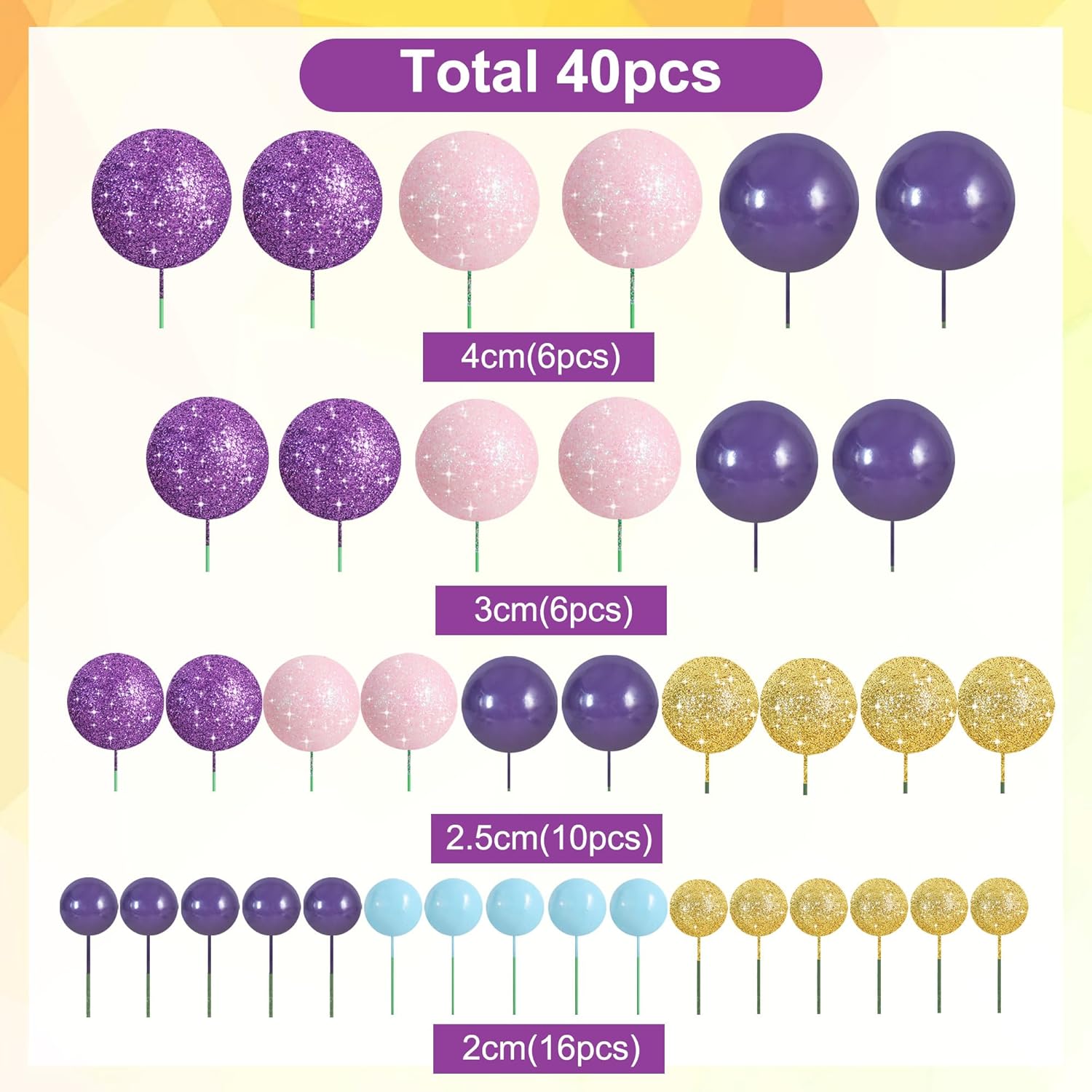 - 【Package include】40 pieces plastic foam balls cake toppers in 5 colors: giltter purple, giltter pink, giltter gold, purple, blue. Size:including 0.79 inch x16, 0.98 inch x11, 1.18 inch x7 and 1.57 inch x6.