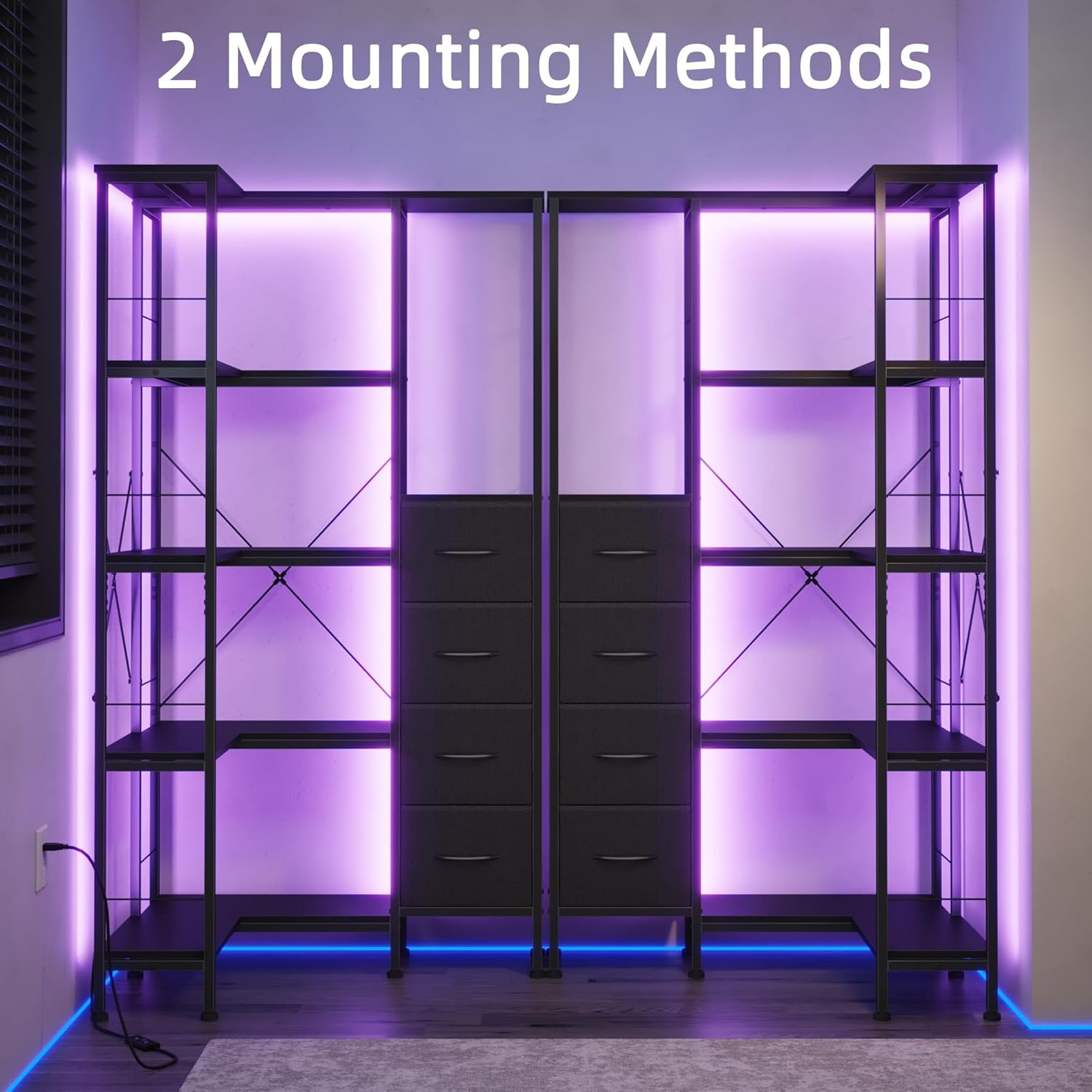 Corner Bookshelf with LED Light Strips & 4 Fabric Drawers, 5-Tier Convertible Corner Shelf with Display Shelf, Large Wood Industrial Bookcase for Living Room, Bedroom, Home Office, Black
