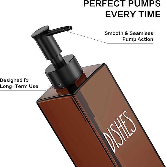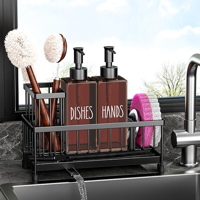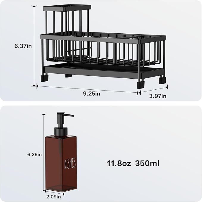Cisily Dish Soap Dispenser, 12 fl oz Dual Kitchen Soap Dispensers with Sponge Holder, Plastic Pump Amber Glass Bottle Kitchen Soap Dispenser Set, Modern Hand and Dish Soap Bottle Set Removable