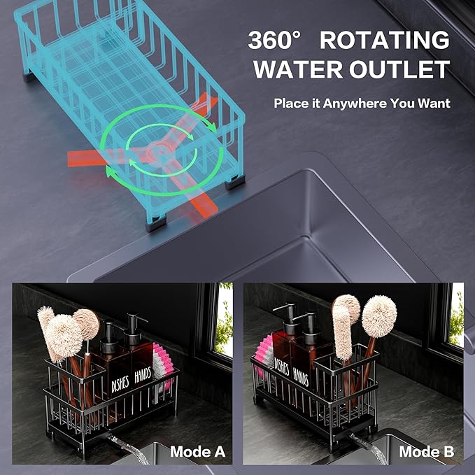 - ROTATABLE SPOUT:This kitchen sink caddy comes with a rotatable spout that swivels in three directions so that the water in the sponge can be directed to the sink. There won't be any water left on the countertop, you don't need to pull out the drip tray to clean it often, saving your cleaning time.
