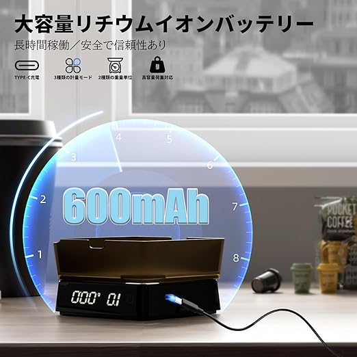 - Type-C Fast Charging & Long Battery Life – Equipped with a built-in 600mAh rechargeable battery, this coffee scale supports Type-C fast charging and provides extended use on a single charge. More eco-friendly and efficient than traditional battery-powered scales, it reduces the hassle of frequent charging and meets the needs of home brewing and travel use.