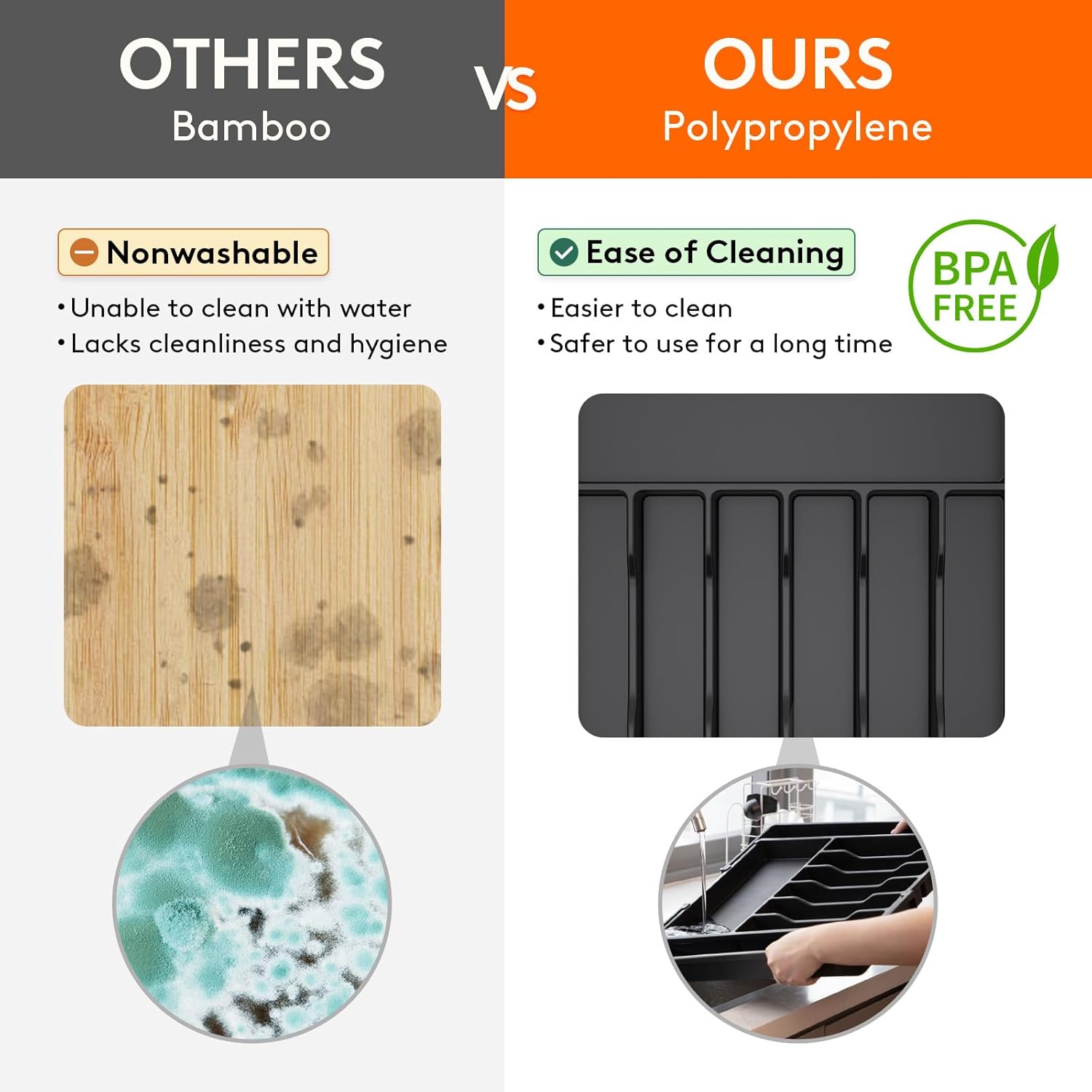 - Robust and Safe: This kitchen drawer organizer is crafted from premium PP material, BPA-free and built to last. It ensures your silverware is stored in a healthy, safe environment for worry-free use