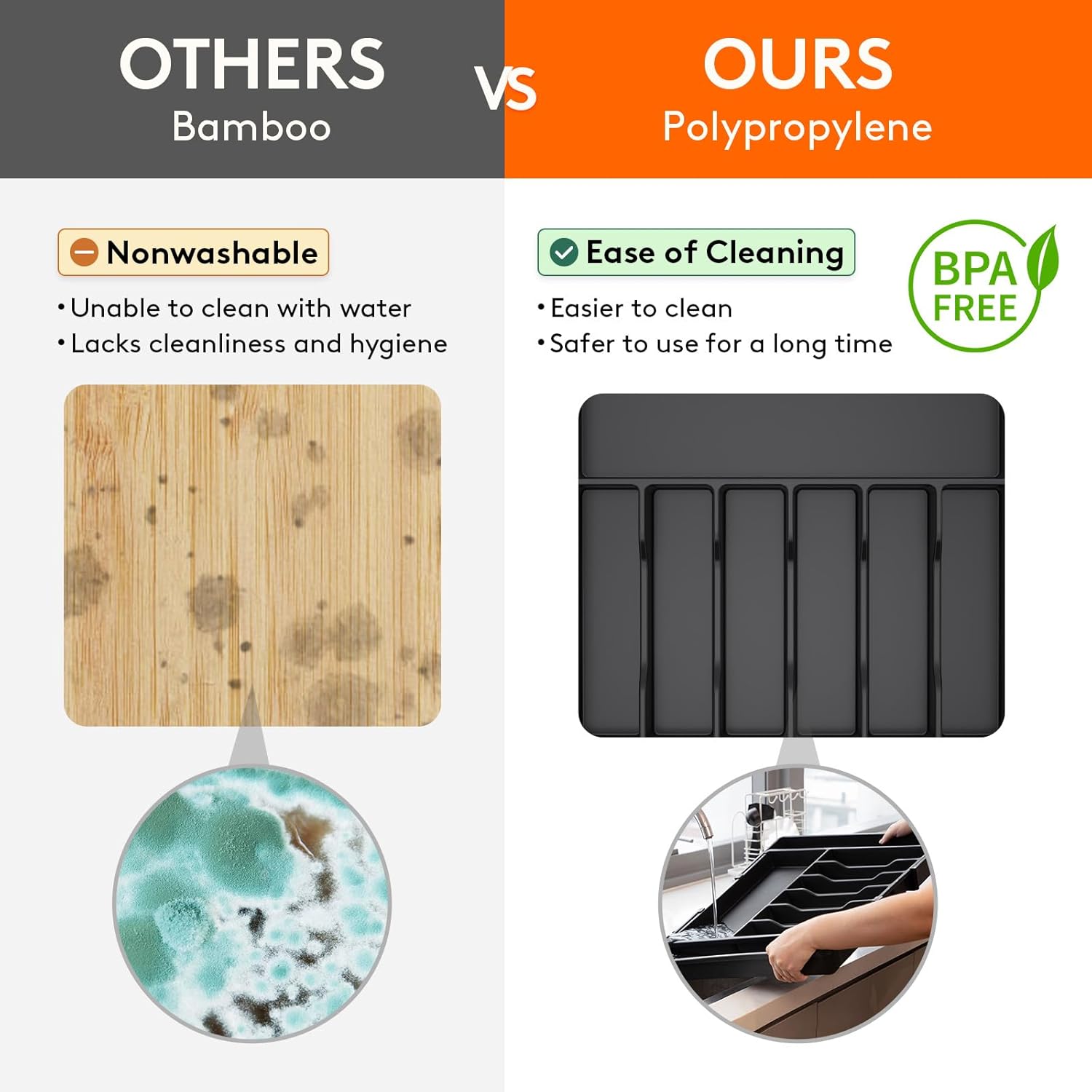- Robust and Safe: This kitchen drawer organizer is crafted from premium PP material, BPA-free and built to last. It ensures your silverware is stored in a healthy, safe environment for worry-free use