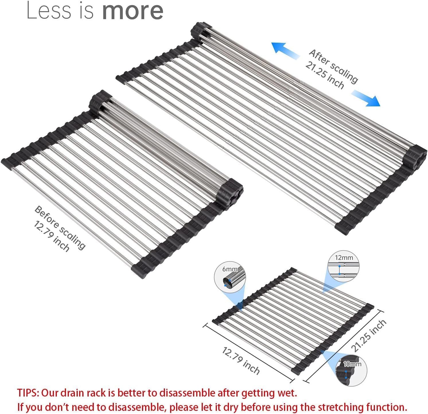 - Expandable & Roll Up Dish Drainer 2 in 1: The over sink dish drying rack Newest Upgraded roll up dish drying rack combined with Expandable function, the width is 12.79", the length can be adjusted from 12.6" to 21.25". No longer worry about buying a dish drying rack that does not match your kitchen sink
