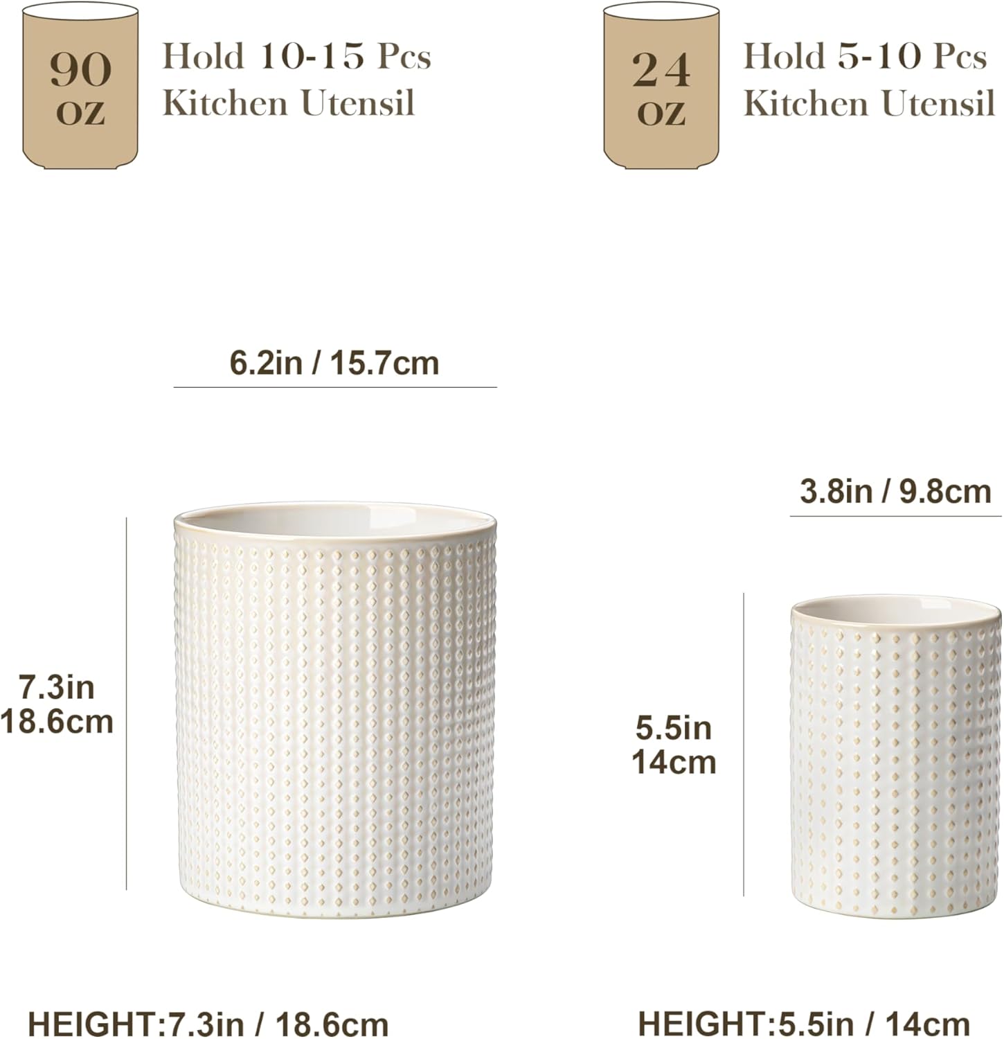 - 【Elegant Ceramic Utensil Crock Set】 – 2-piece set includes a large crock (6.2″×7.3″, 90oz) and a small crock (3.8″×5.5″, 24oz), perfect for keeping your kitchen tools neatly organized and within reach.