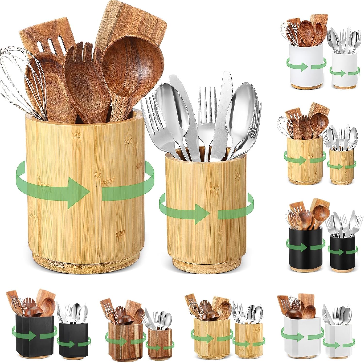 2 Pack Wooden Utensil Holder, 360°Rotating Kitchen Cooking Utensil Crock, Spoon Spatula Holder for Kitchen Counter, Farmhouse Countertop Organizer(Bamboo,Round)