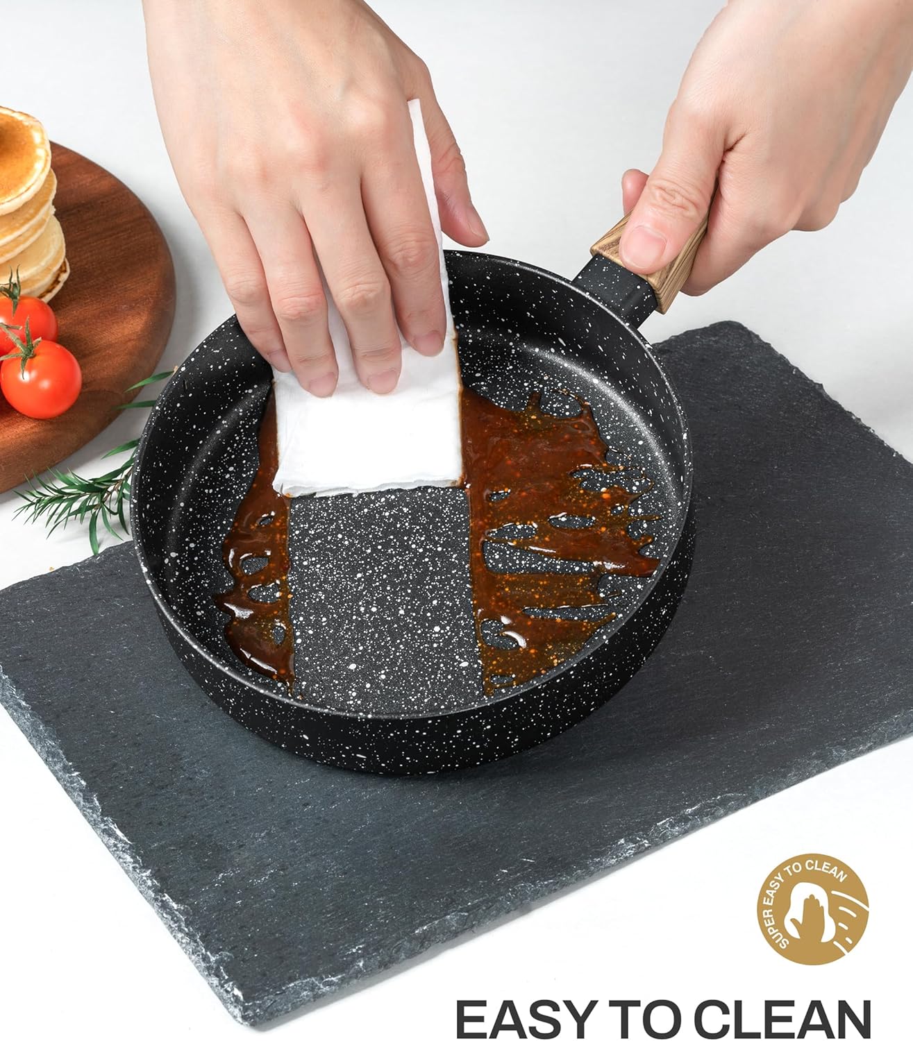- COMFORT & EASY CLEAN - Features a cool-touch handle to prevent burns and a stain-resistant surface. Our small pan is comfortable to use and wipes clean in seconds.