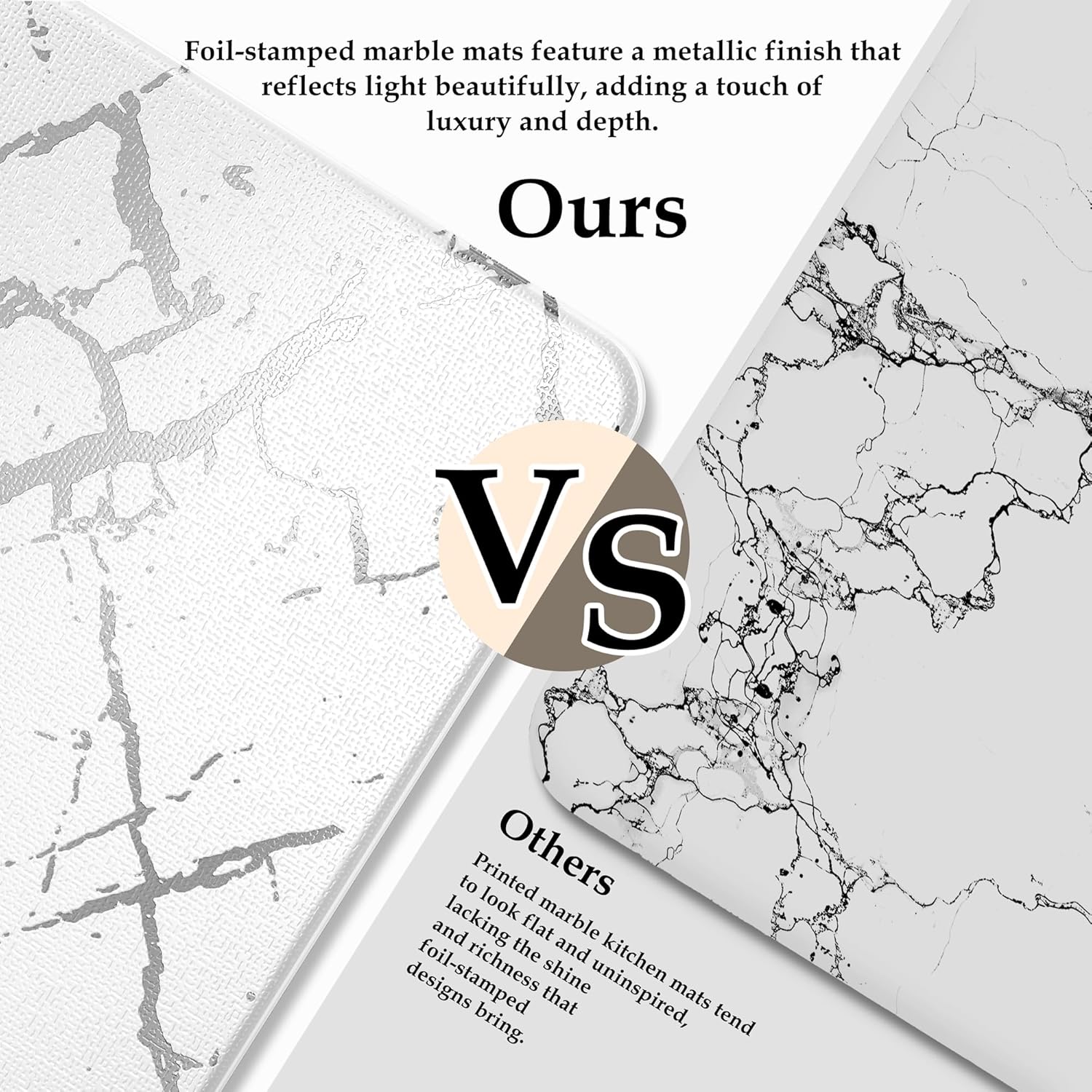 Silver Foil Stamped Marble Kitchen Mats for Floor 2PCS Cushioned Anti Fatigue Non Slip Waterproof Comfort Leather Kitchen Rugs 2/5 Inch PVC Kitchen Mats for Sink, Laundry, 17.3"x28"+17.3"x59",White