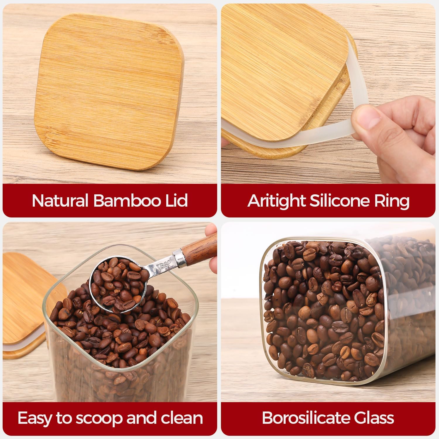 - 【Airtight Seal for Lasting Freshness】Each lid is equipped with a silicone sealing ring to ensure an airtight closure, protecting your ingredients from moisture and keeping flavors locked in—perfect for preserving coffee aroma and sugar texture.