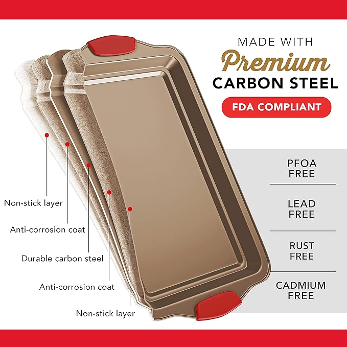 - Silicone Handles: Red silicone grips on our oven pan set ensure a solid, comfortable grasp. Our small, medium, and large cookie sheets for baking, nonstick set is BPA-free and PTFE/PFOA/PFOS-free.
