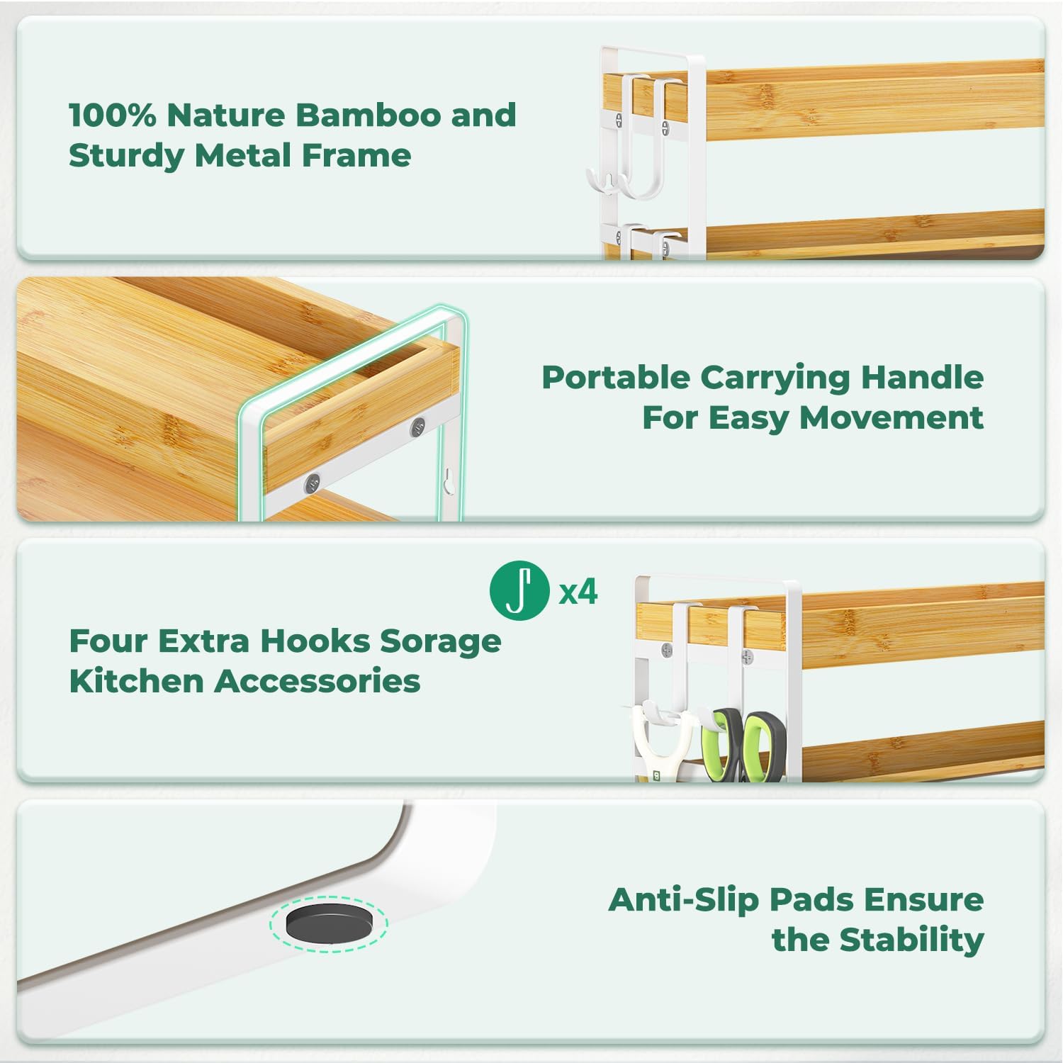 EsLuker.ly Spice Seasoning Rack Organizer Kitchen Countertop, 4 Tier Bamboo Spice Shelf Holder Storage with 4 Hooks, Wall Mounted Freestanding Stand for Pantry, Bamboo-White(Jars Not Included)
