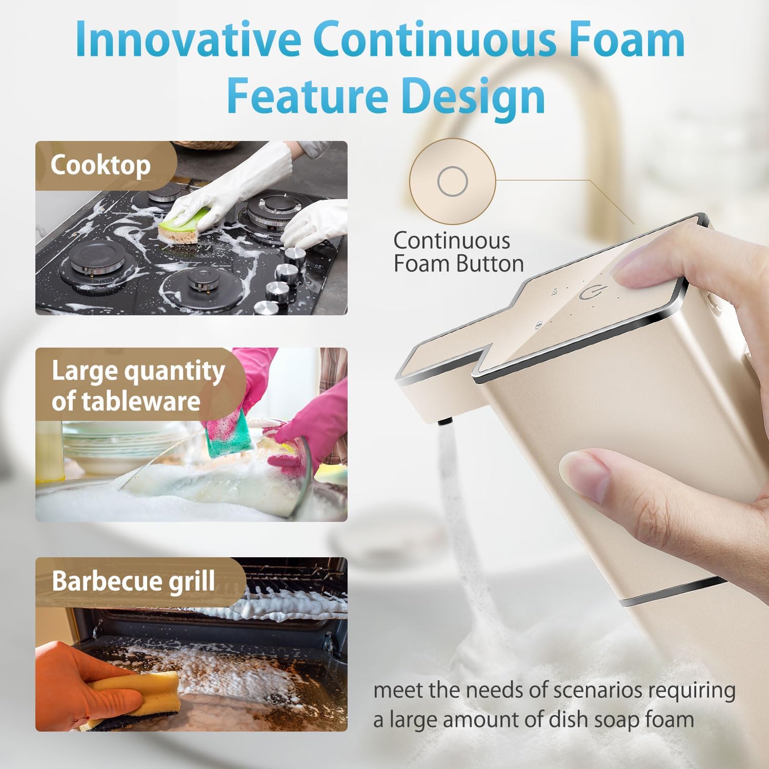 - 【Continuous Foam Design】 With a simple press of the continuous foam button, a steady stream of foam is effortlessly dispensed. This feature is perfect for tasks requiring large amounts of foaming soap, such as washing multiple utensils, cleaning stovetops, dining tables, barbecue grills, and more.