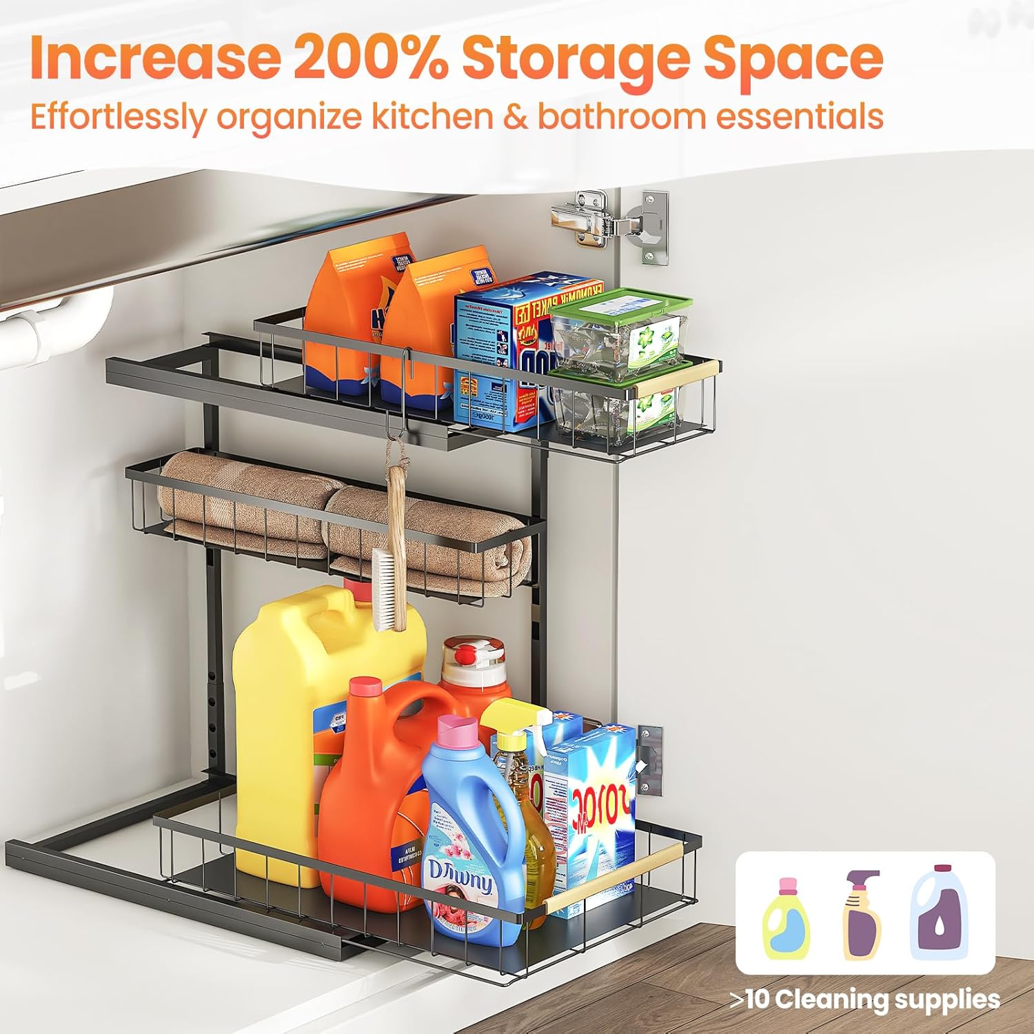 - Quick and Tool-free Setup: No drilling required! It can be assembled in a few minutes and is suitable for most standard cabinets. The 4 hanging hooks provide additional hanging space for commonly used tools such as sponges or scissors