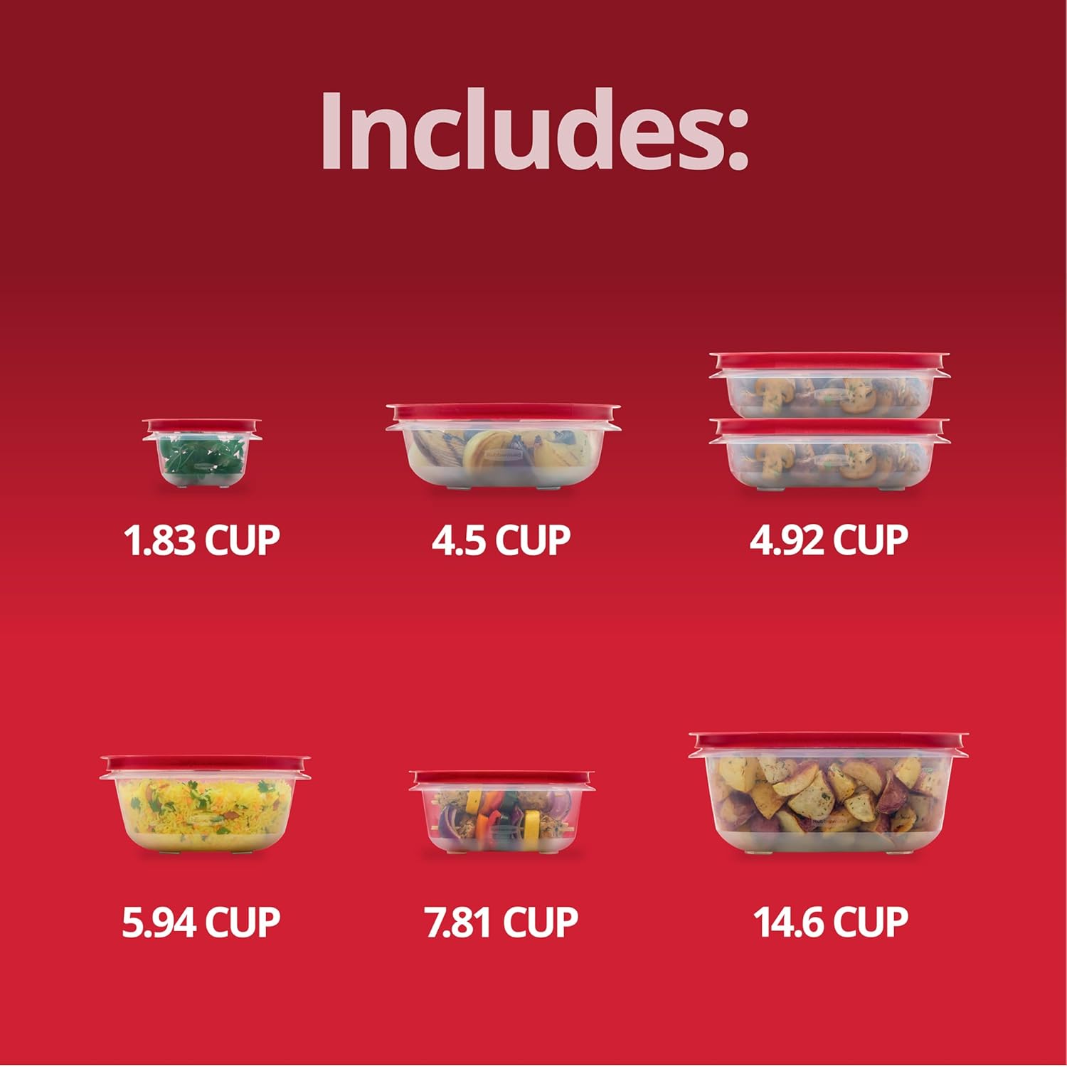 - Multiple Pieces: Includes one 14.66-cup container and lid, one 7.81-cup container and lid, two 4.92-cup containers and lids, one 1.83-cup container and lid, one 5.94-cup container and lid, and one 4.5-cup container and lid.
