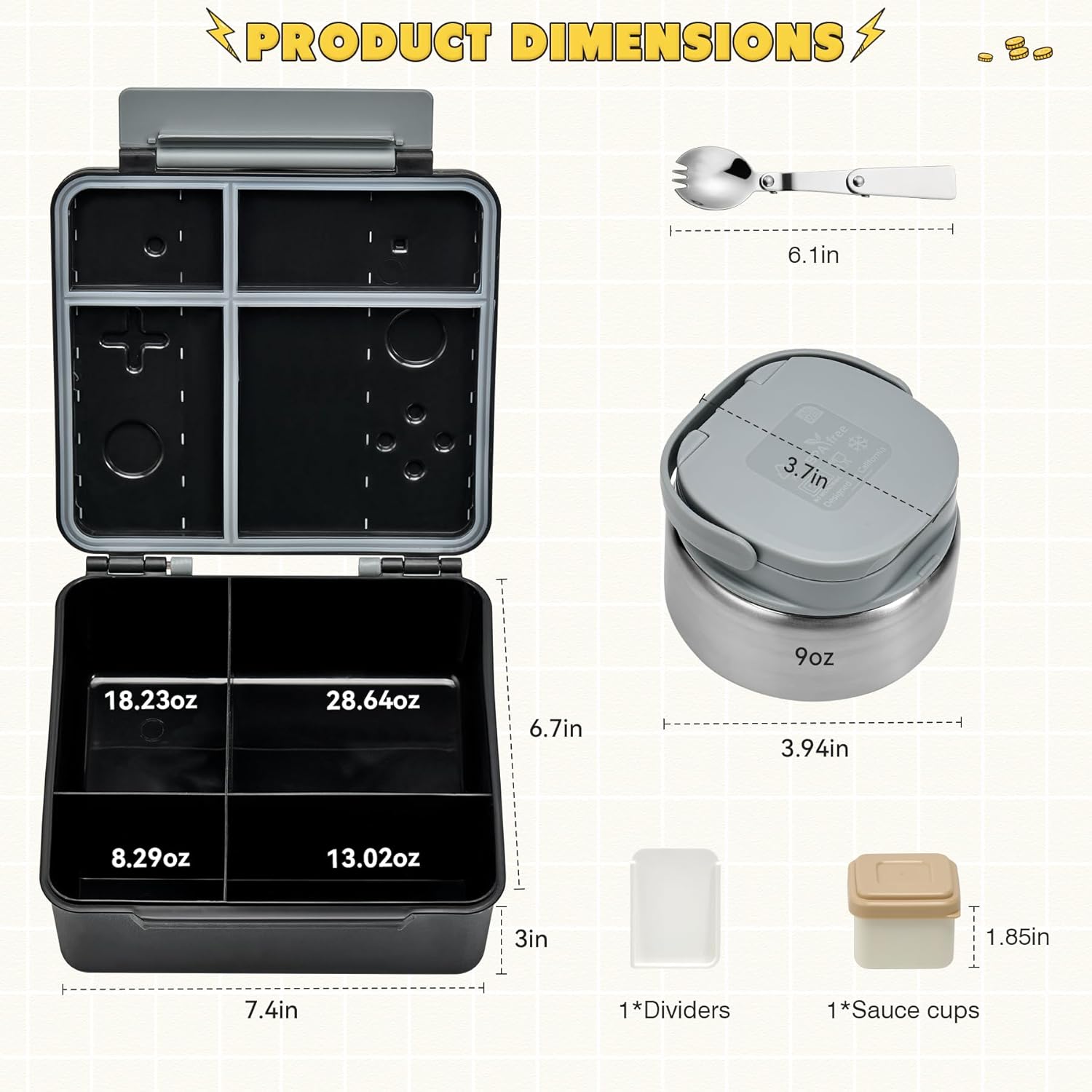 - Multi Compartment Design: Our lunch box have dividers and dip cups, and removable dividers allow you to customize the compartments for sandwiches, fruit, snacks, or regular meals. Individual sauce cups won't allow sauce to spill onto other foods and meals will be more flavorful! The perfect kids lunch box for school, traveling or picnics!