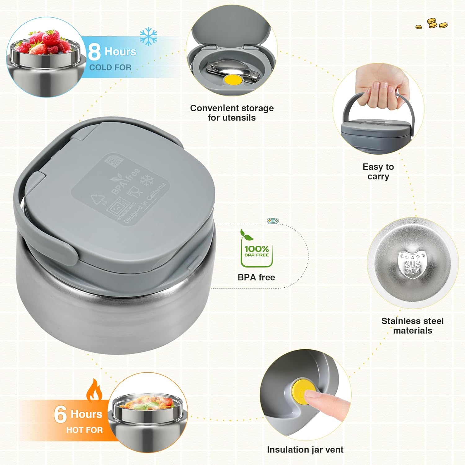 - 9 OZ Stainless Steel Insulated Food Jar: The exclusive spoon storage compartment on the lid of the insulated food jar keeps your folding stainless steel spoon neatly organized so you don't have to worry about forgetting to bring a spoon. The insulated food jar in our lunch box set also has a built-in vent button to prevent pressure buildup and make it easy to open.