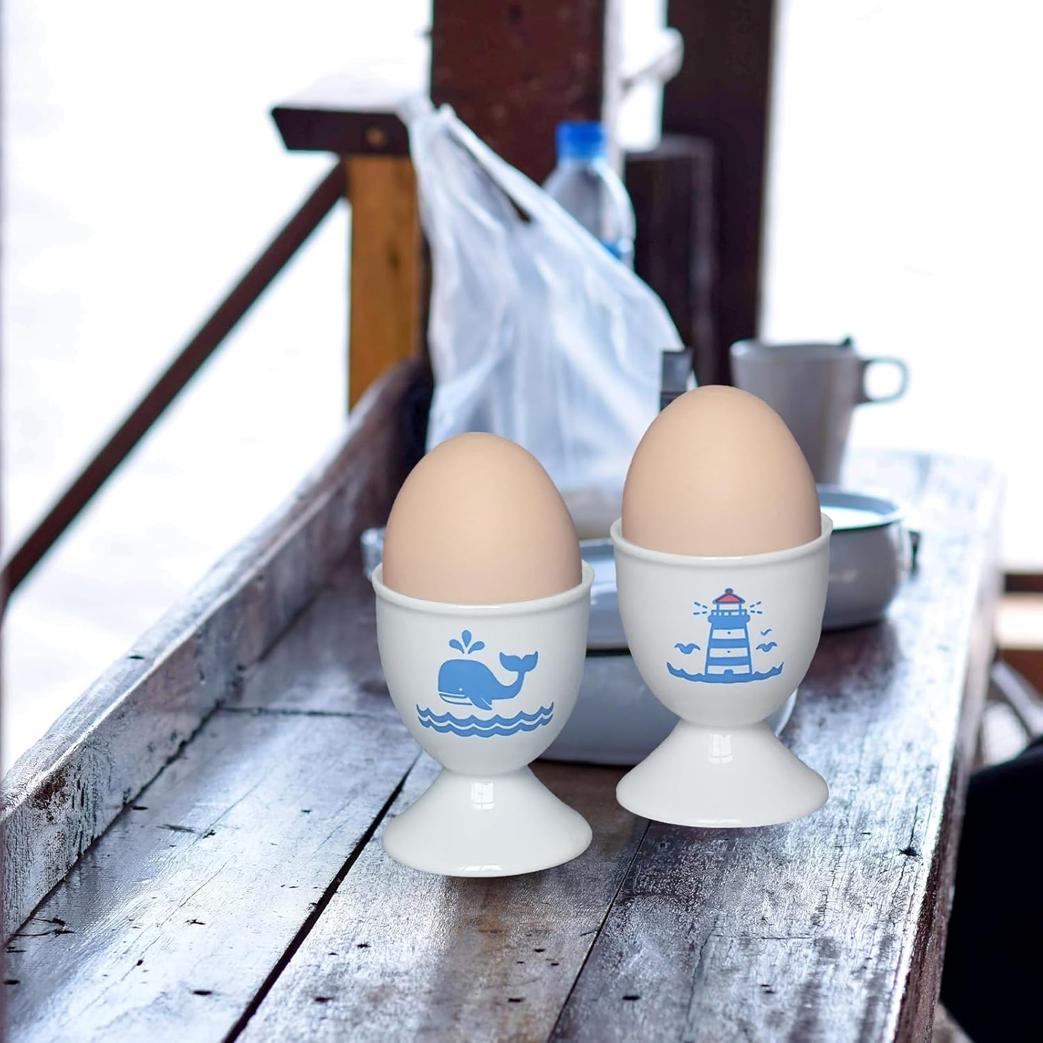Cinf Ceramic Egg Cup Set of 2 Porcelain Holder Breakfast Boiled Cooking Easy to Clean Childhood Memories Kitchen(Lighthouse Whale)